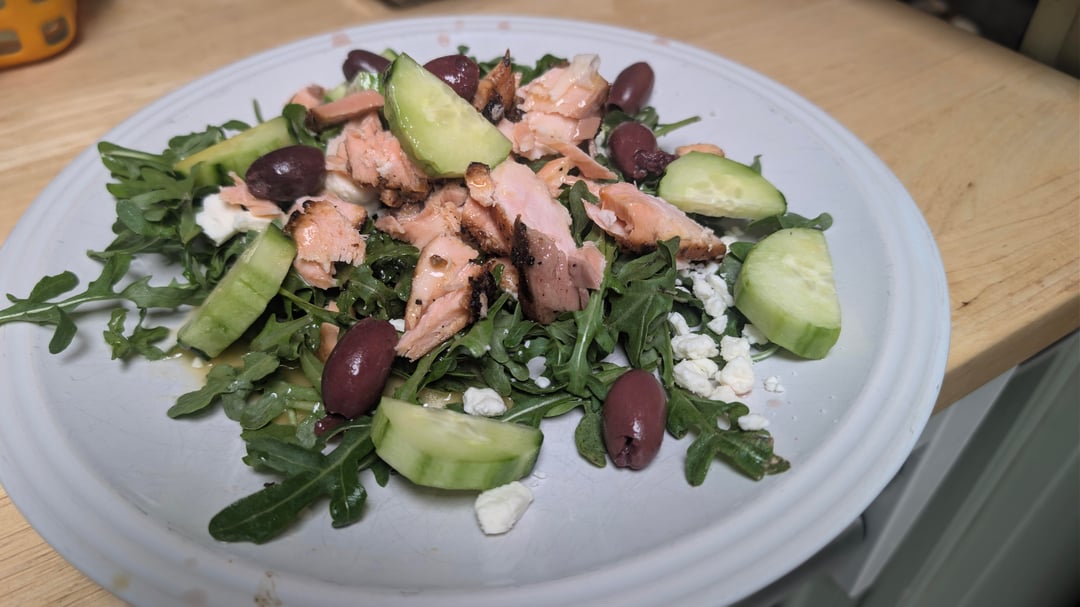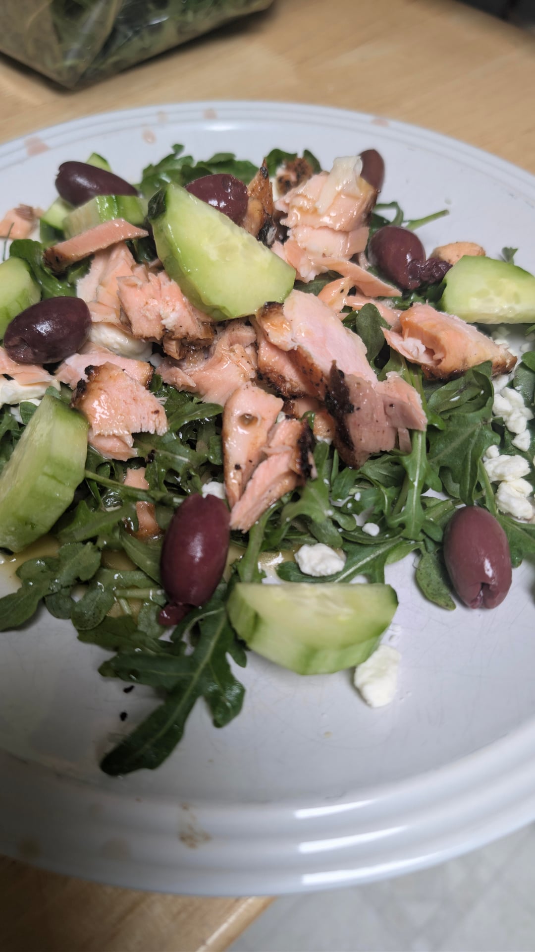 Random stuff in the fridge put a salad together. Arugula, salmon, feta, olives, cucumbers. Wish I had some farro. Yummy dressing too! See picture for recipe. by MinimalPeach 1 Comment Fuzzy_Welcome8348 1 week ago Looks lovely!