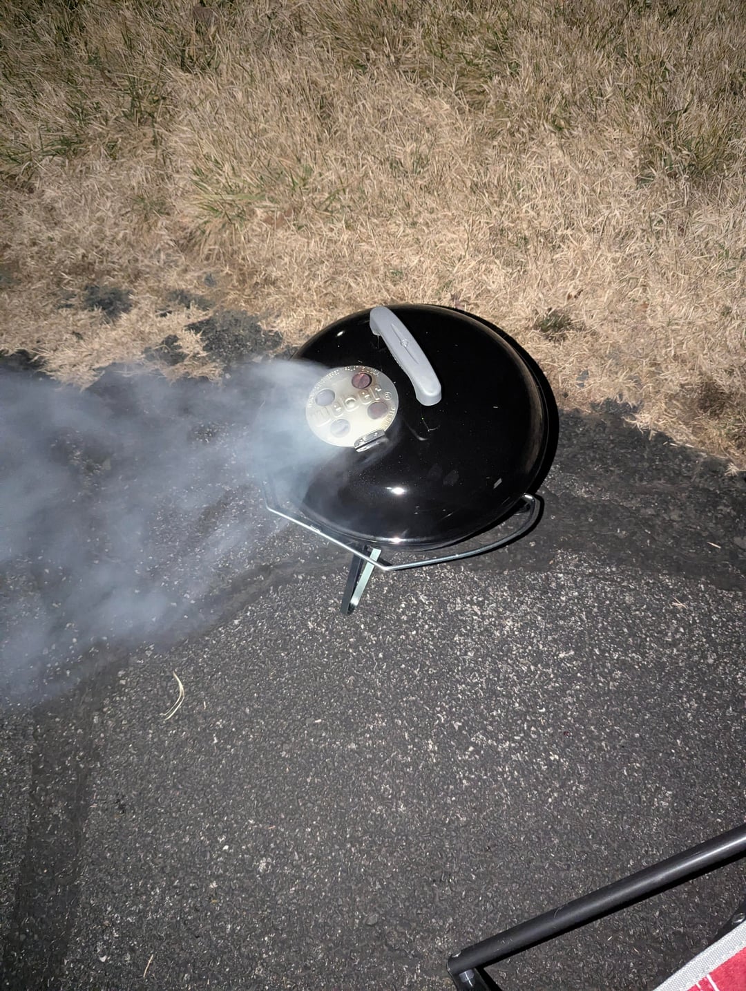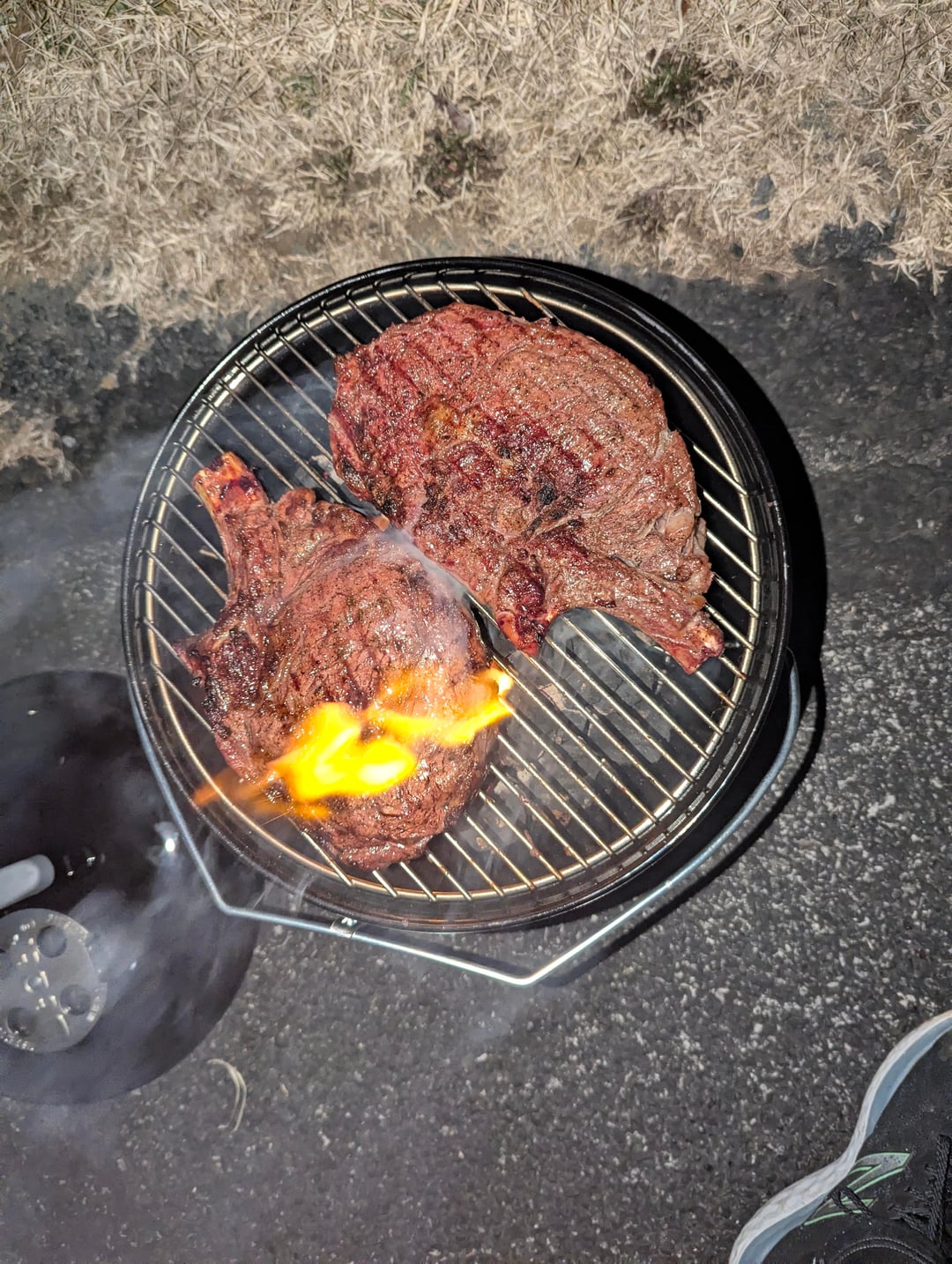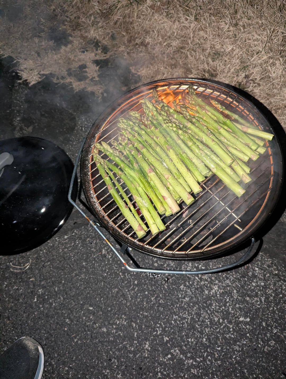 Air BNB didn't list it had a grill and we wanted steak… bought a 14" smokey joe cause I wasnt dragging the 22" kettle 6 hours away… fit 2 36oz ribeyes and 2 bunches of asparagus… sorry I forgot the money shot