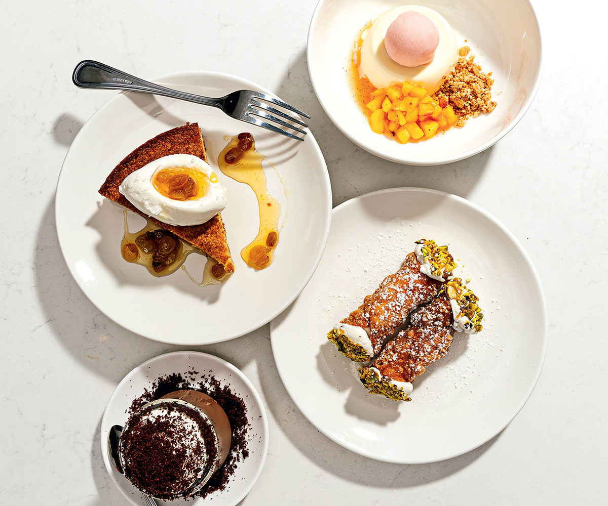 Katherine Thompson’s desserts include olive-oil cake, crème fraîche panna cotta, cannoli, and chocolate budino.