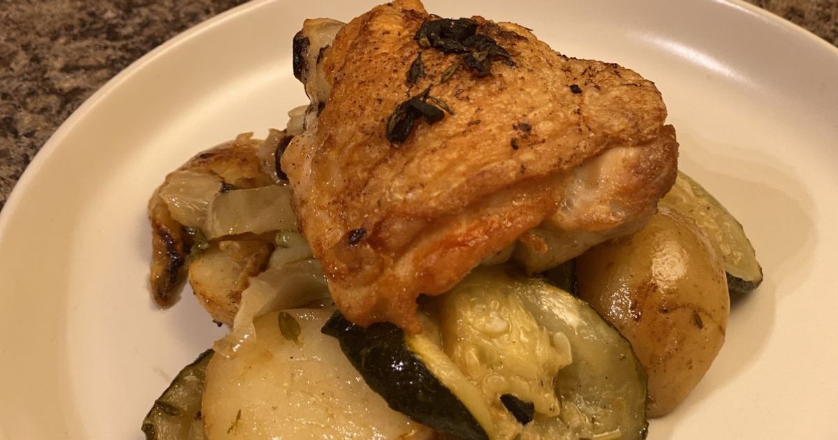 For Rick Stein’s chicken traybake recipe, he suggests simply using chicken thighs nestled on a bed of fennel, sliced courgettes, and baby potatoes.