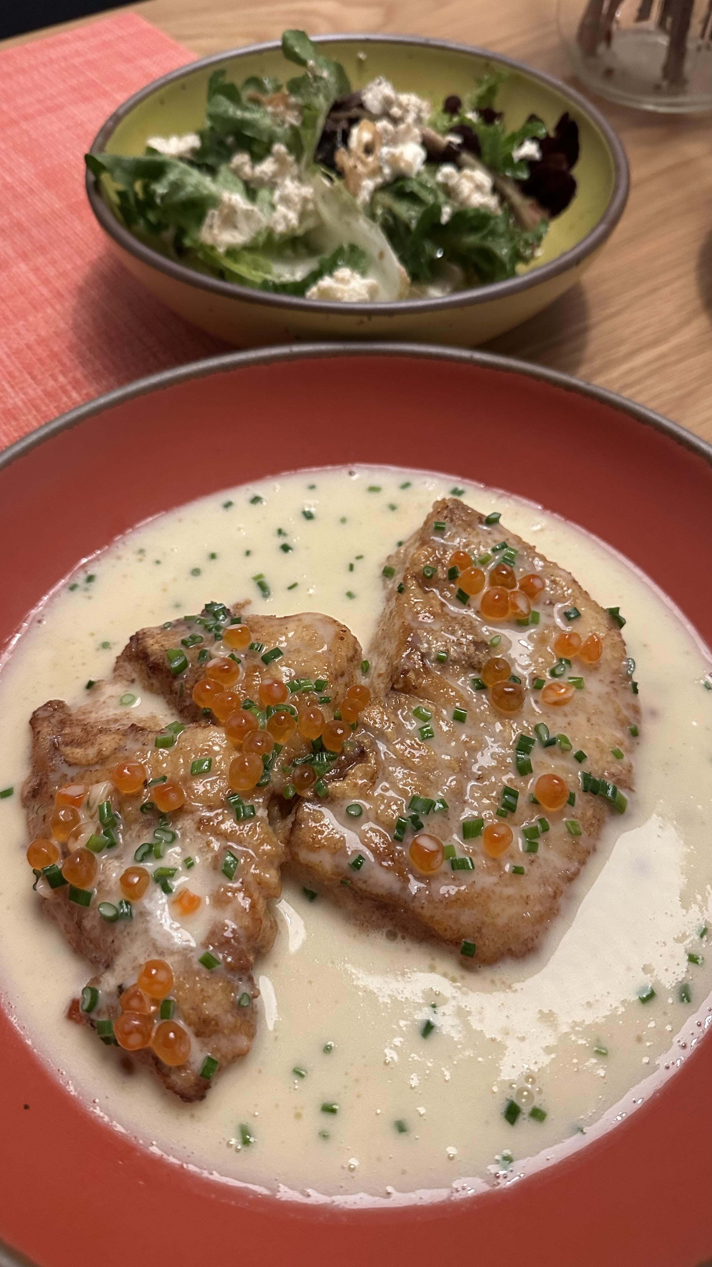 fish: [this](https://chuckycruz.substack.com/p/pan-fried-flounder-with-dashi-beurre?utm_campaign=posts-open-in-app&triedRedirect=true) with cod in lieu of flounder and salmon roe garnish in lieu of sliced fruit