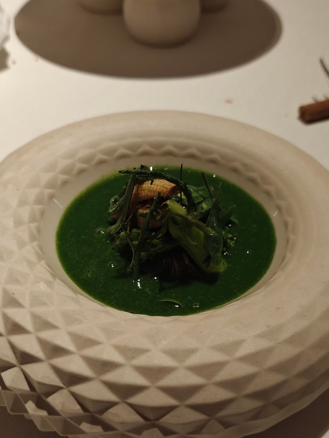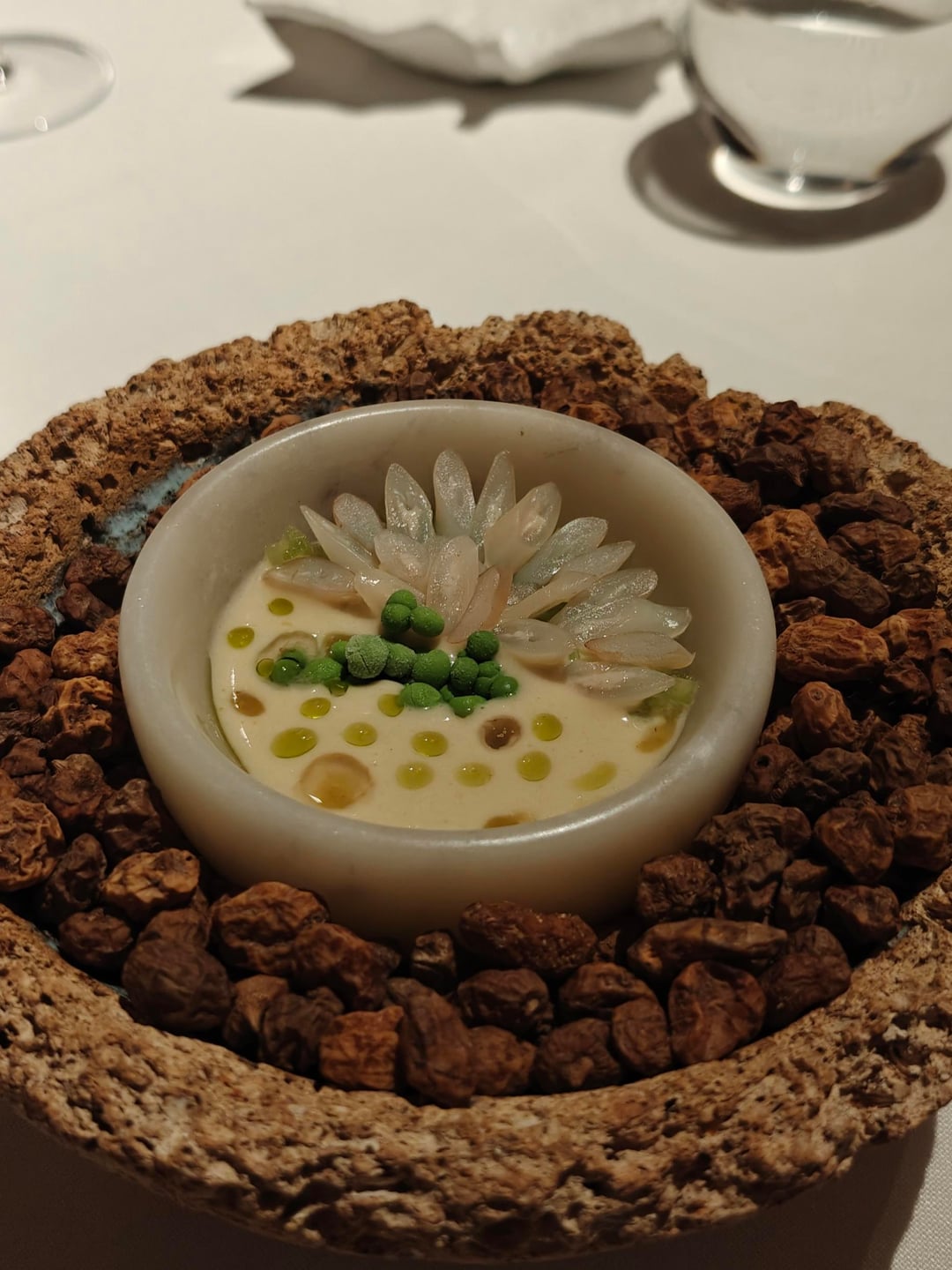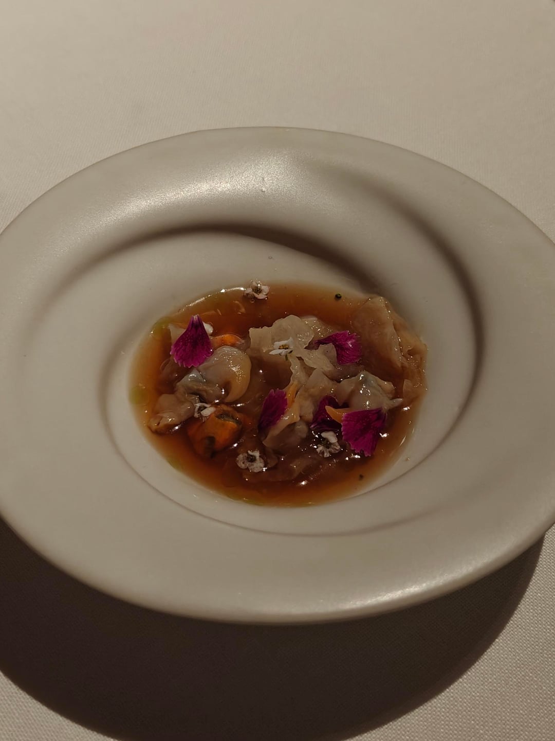 Before moving onto the actual main dish, I got a salpicon of bivalvia (a type of shellfish), which tastes of a bright vinegar. The first real meat dish was a stew of serrano pork with thyme foam. Afterwards, I was served a quail in a pickle fond and a quail leg on the side.