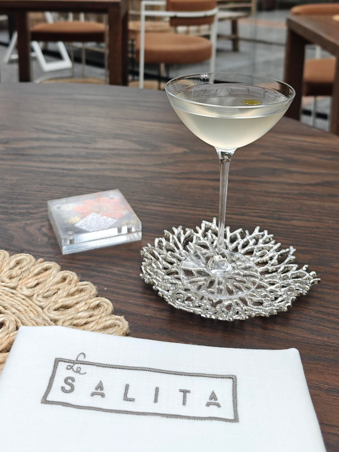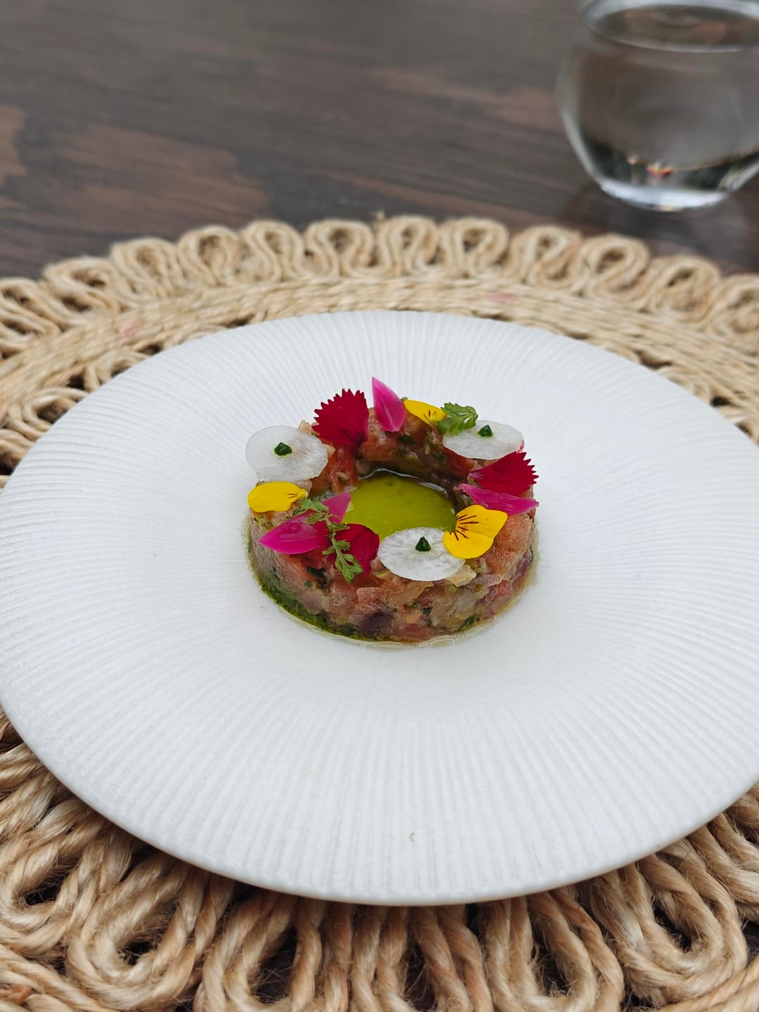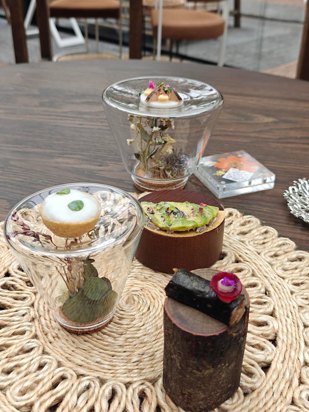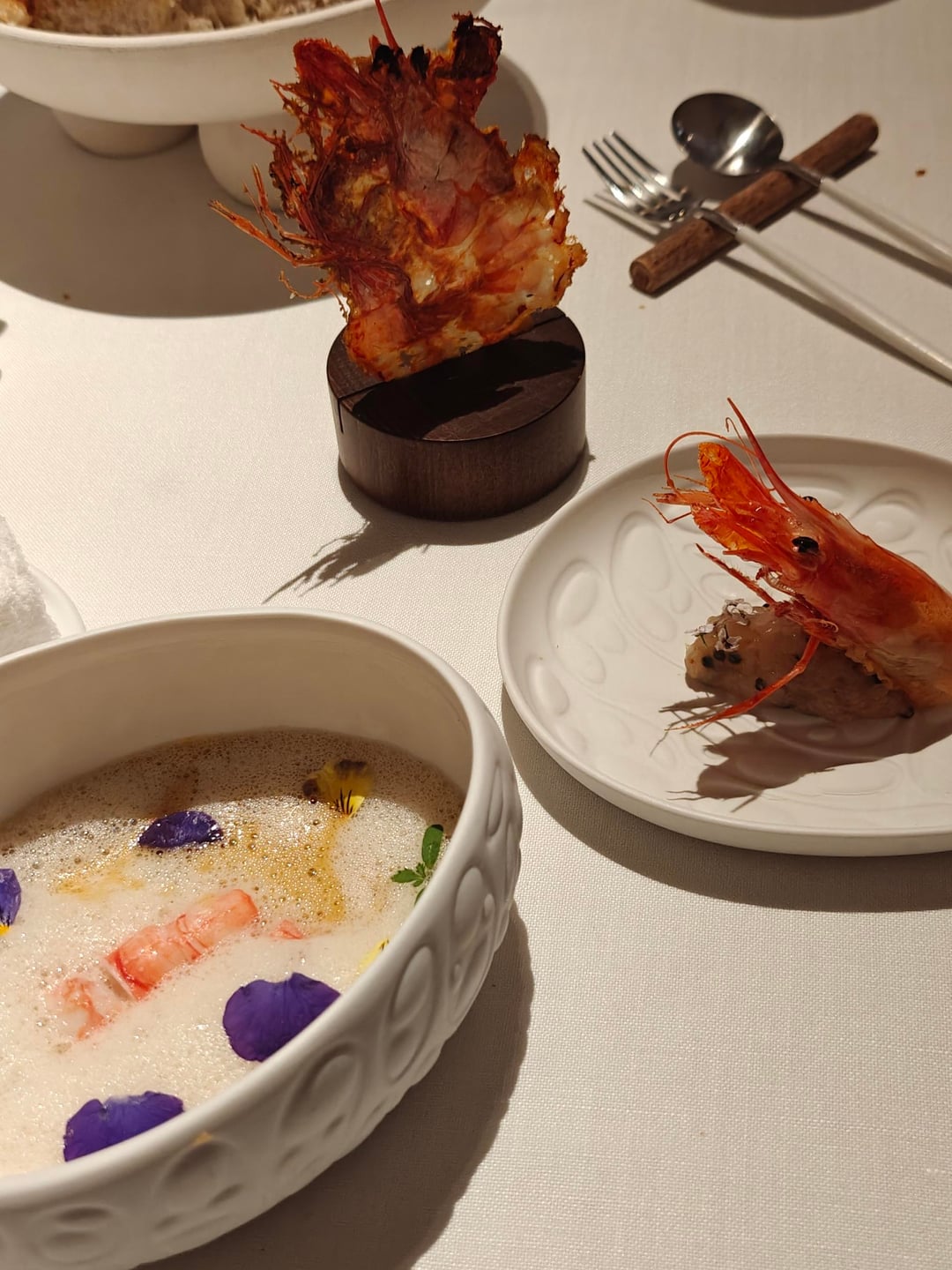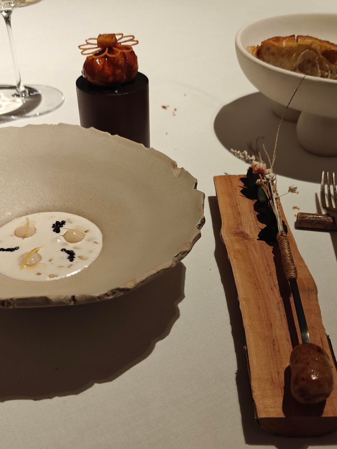 I started off in the 'greenhouse' outside for a cocktail, made by their own cocktail bar right outside, and the appetizers. Seeing as I went for the full thirteen-course experience, describing each dish would take too long. I have included the full menu at the end. The menu started off strong with four appetizers meant to be eaten by hand and each presented on custom-made plates. A tuna 'tiara' set the theme: elegant creativity.