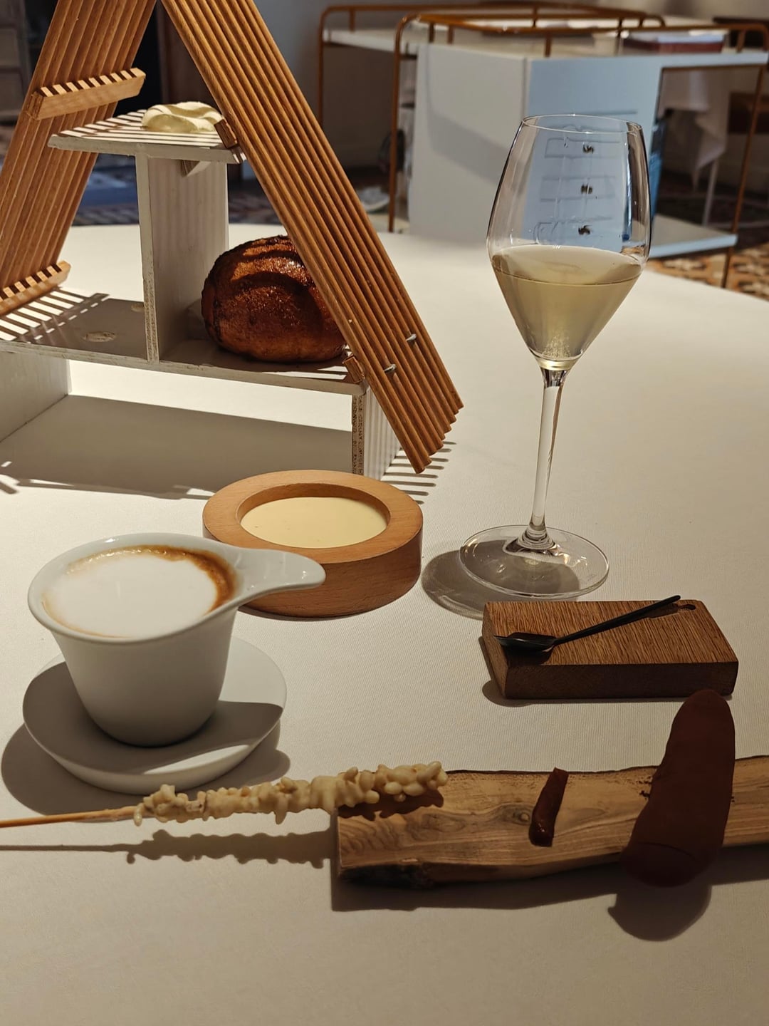 Afterwards, I got a tour of the downstairs lounge area and wine cellar by the sommelier. After the bread and homemade butter, the main dishes commenced with razor clams in a tiger nut cream. Tiger nuts are a Valencian specialty and used to create the classic horchata. Most, if not all of the dishes were created with local ingredients. A vegetable course with goose barnacles (bercebes) was followed by three textures of gamba. Then, squid in its own ink with a sort of dashi broth. A true surprise came with the next course, eel – again in three ways – the most surprising being in a trompe l'oeil sausage.
