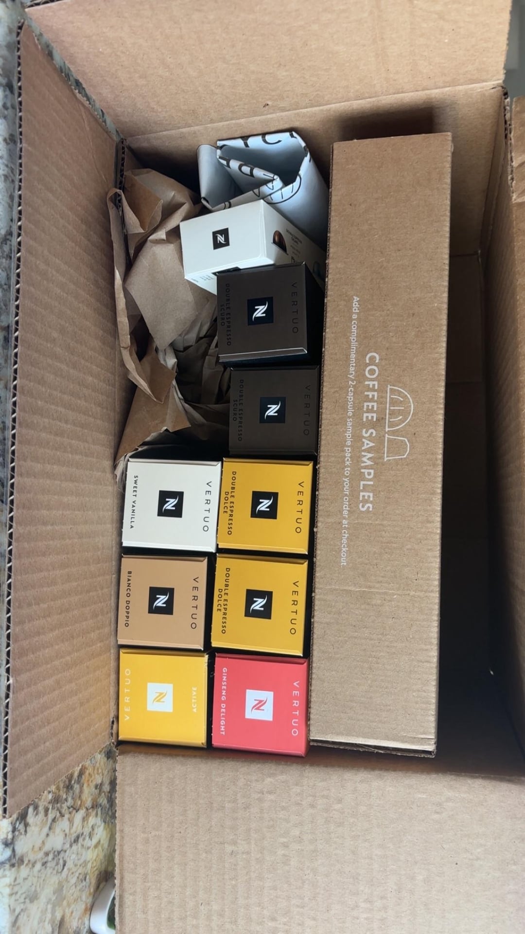 I was gifted my vertuo at the end of December along with five sleeves and the sample box. My first order using the welcome code I ordered five sleeves but to get the free gift this time I had to order 7. I ordered 8 because boy do I go through these quicker than I would think. The free gift was a free sleeve with two coasters. The coasters are decent quality and I usually like Colombian coffee which is what the sleeve was. I get glass mugs next. I’m still trying to figure out which pods I like. I use two double espresso pods for lattes but also will drink a double shot black. I like the dolce & scuro for lattes but wanted to try some flavored ones. Open to any recommendations! Also thoughts of the Active pod? I’m excited to try it.