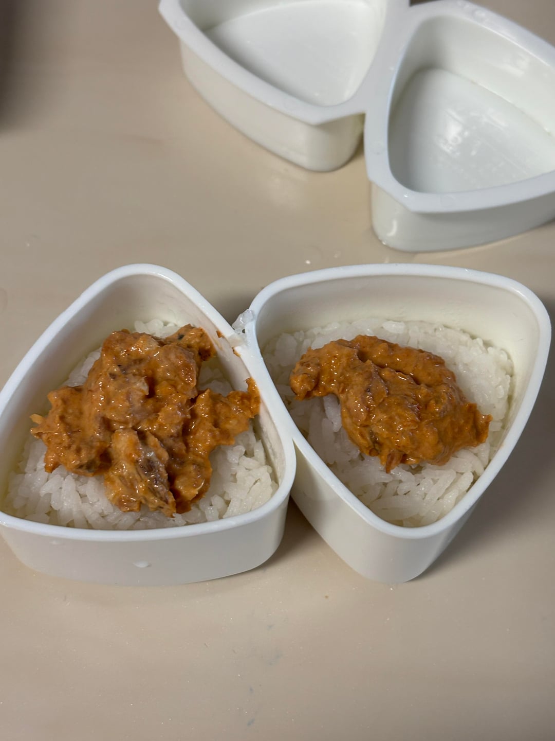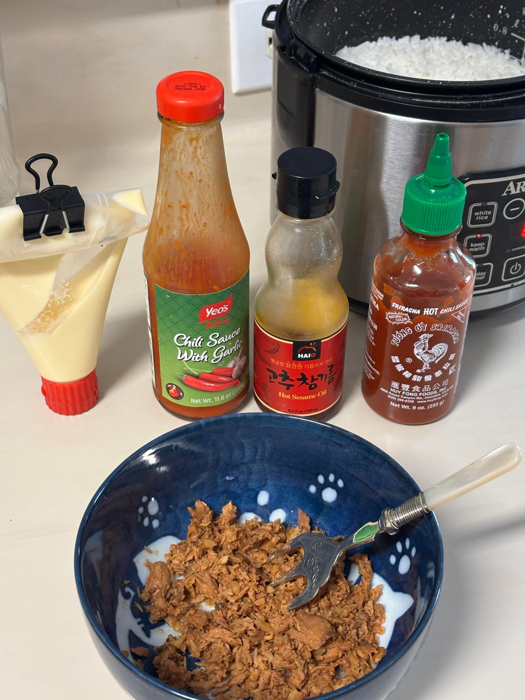(7-13) Making the Onigiri – in decided to make spicy onigiri, so I added some Yeo’s chili garlic sauce, some hot sesame oil, Sriracha and kewpie mayo. Stir it up, let it sit for a few minutes to let flavors develop, then correct to your taste.