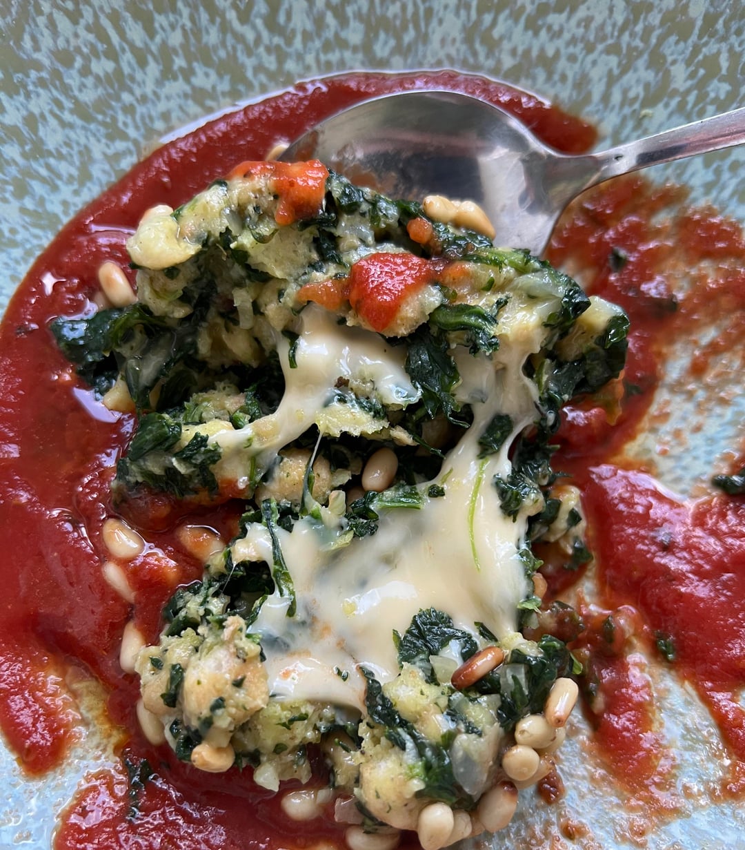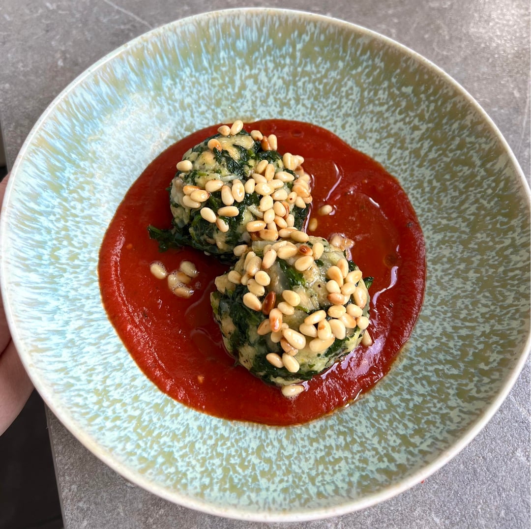 Bread and spinach dumplings with cheese filling, tomato sauce and pine nut butter.by frankenstein-victor Dining and Cooking