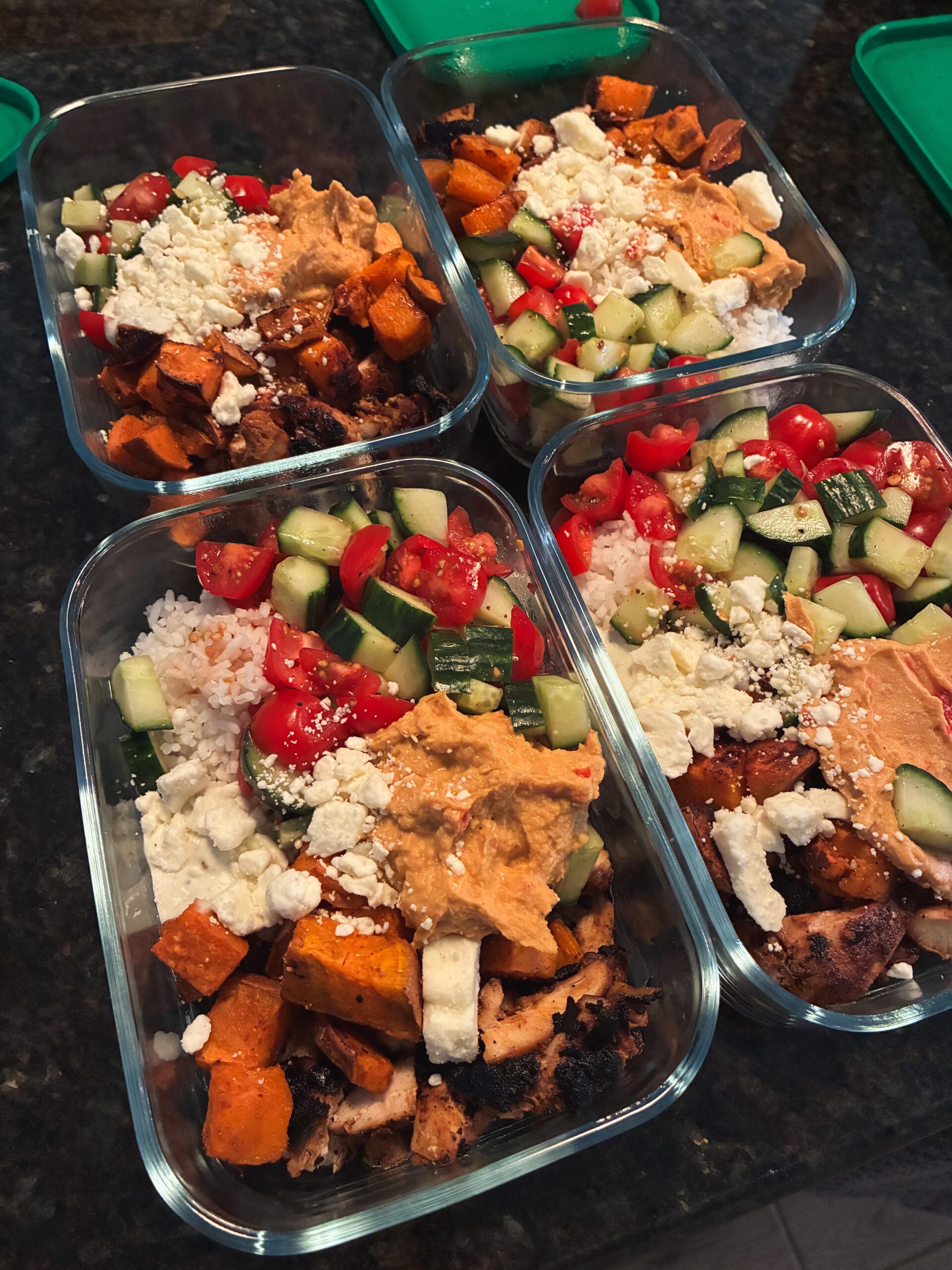 FlyBoi114 1 week ago (I couldn’t edit the original post) 750g chicken thighs (Marinated in 42g honey, ⅛ cup EVOO, a splash of Worcestershire sauce)Hummus (55g per bowl)Cuke and tomato salad (A whole cucumber and a small pack of grape tomatoes, cubed, in a splash of EVOO)1200 g Sweet potato (Cubed with garlic powder, paprika, salt and pep, tossed in 2 tsp of EVOO and baked at 425 for 45 min, turning halfway)Tzatziki sauce (1 tbsp per bowl)Feta (17g per bowl)Not included is the rice