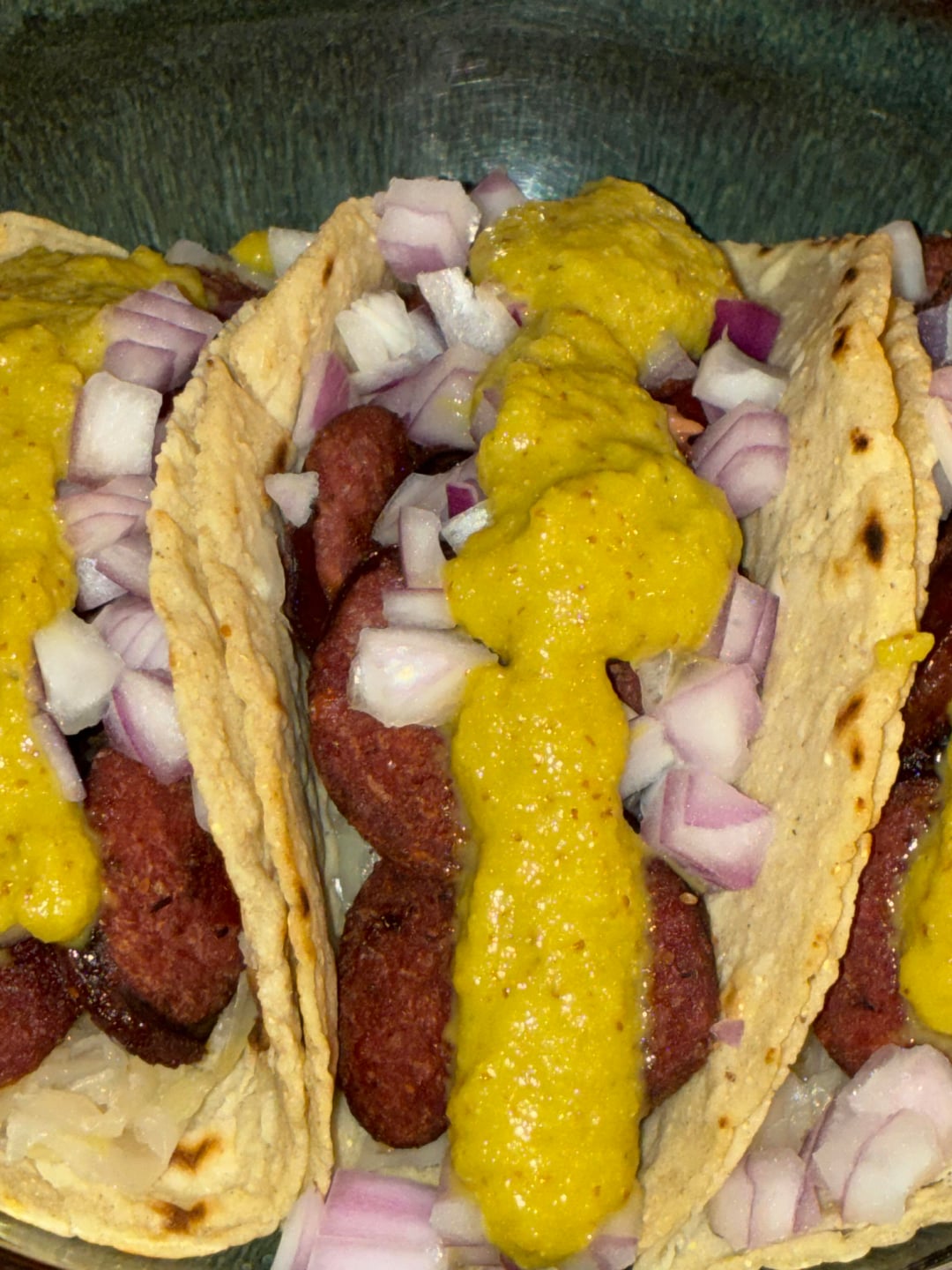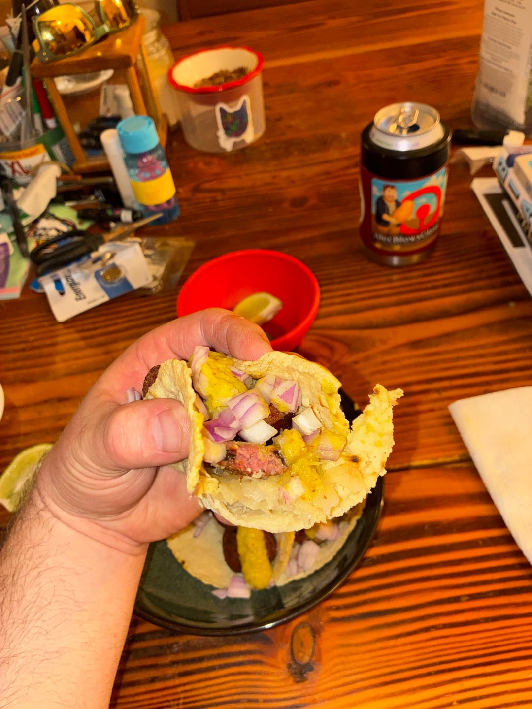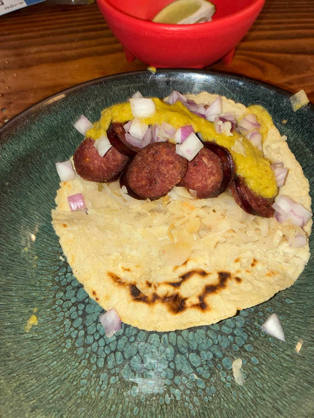 Hola! Inspired by @Flapjackk777 making Kielbasa tacos. I thought since Keilbasa is commonly served with Sauerkraut, and onions- make a take on tacos going in that direction. I made a pickled jalapeño, carrot, and onion salsa with a decent amount of stone ground mustard. I cut the kielbasa into coins and fried them up in some olive oil. I also made white corn tortillas for the whole thing. Overall- excellent concept. 10/10 will make again!