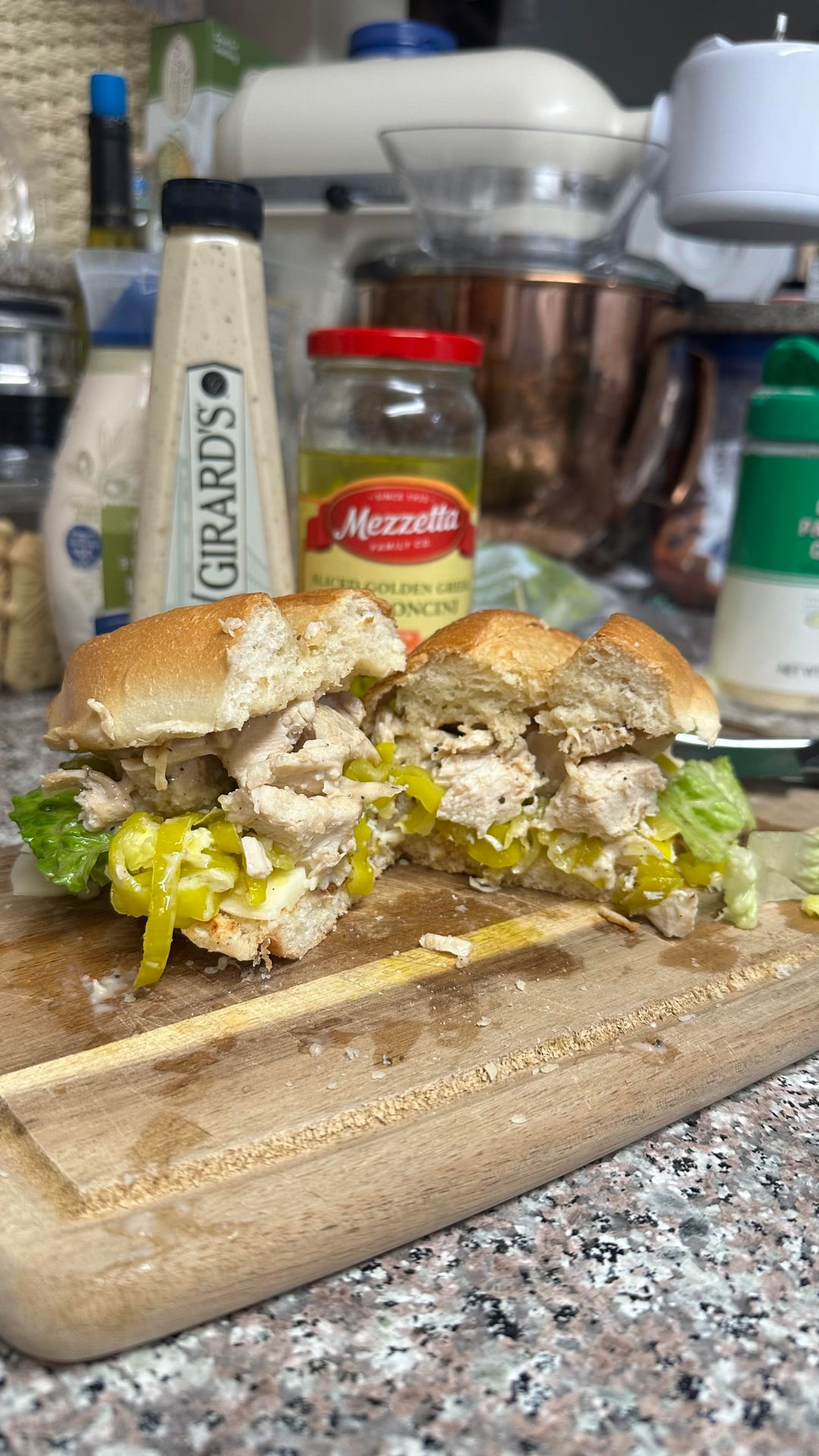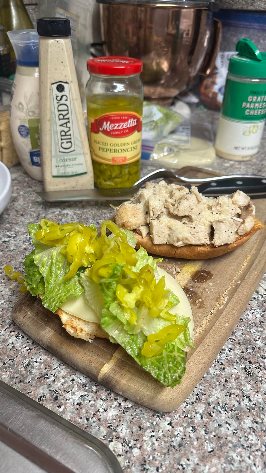 Toasted Bolillo , provolone, cesar dressing, lettuce, rough chopped chicken breast, Parmesan , squirt of lemon juice.by RJtheplug 3 Comments Unique-Princess-1026 6 days ago Looks amazing 😋 Wr3ckless13 6 days ago Looks delicious, extra points for the pepperoncinis Traditional_Isopod80 6 days ago Yum!