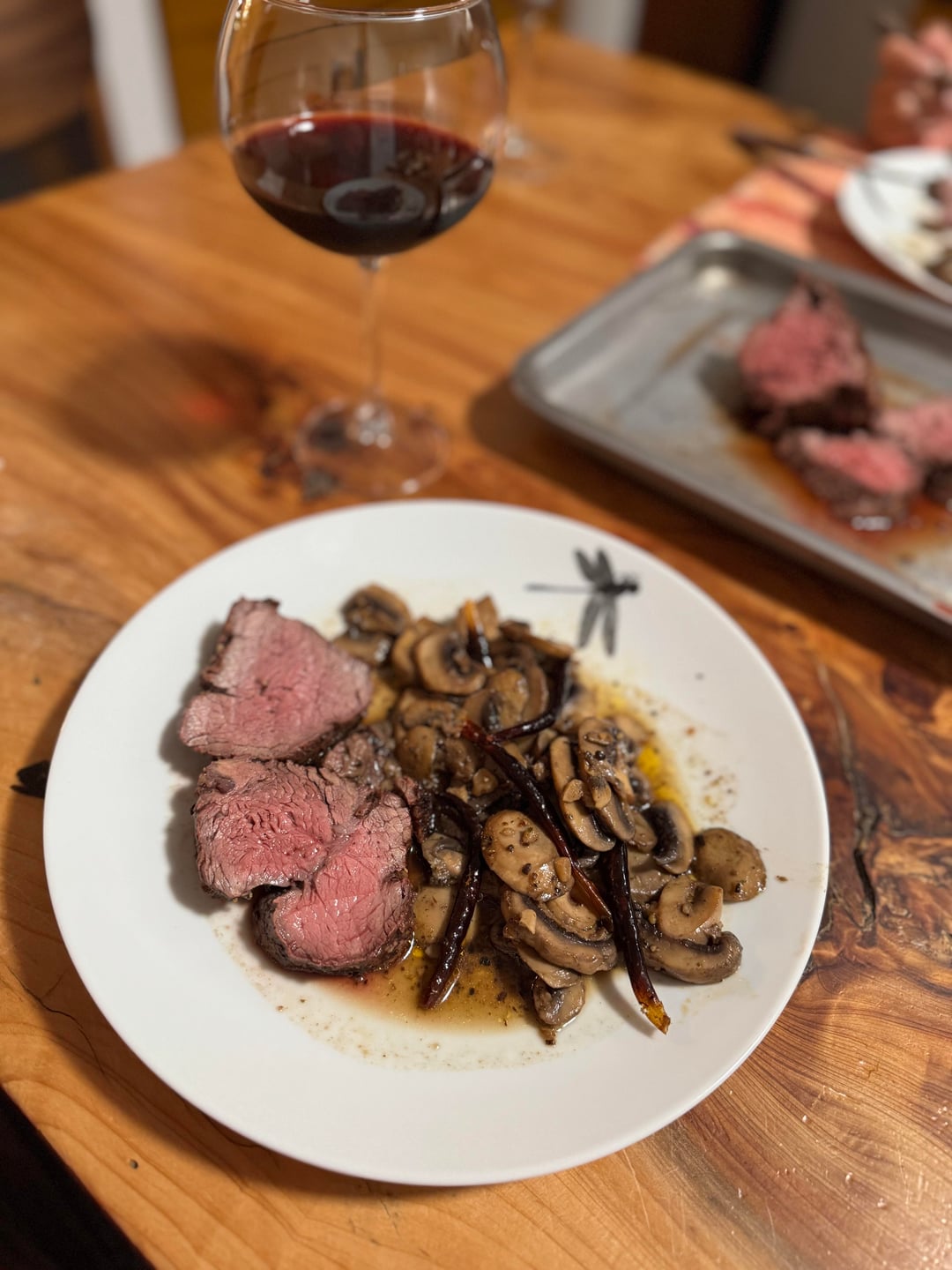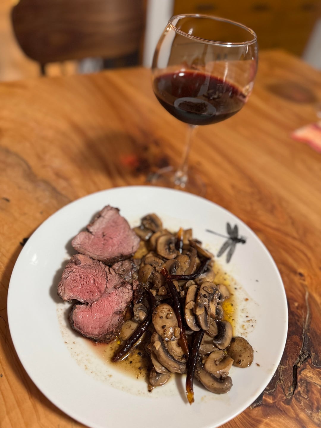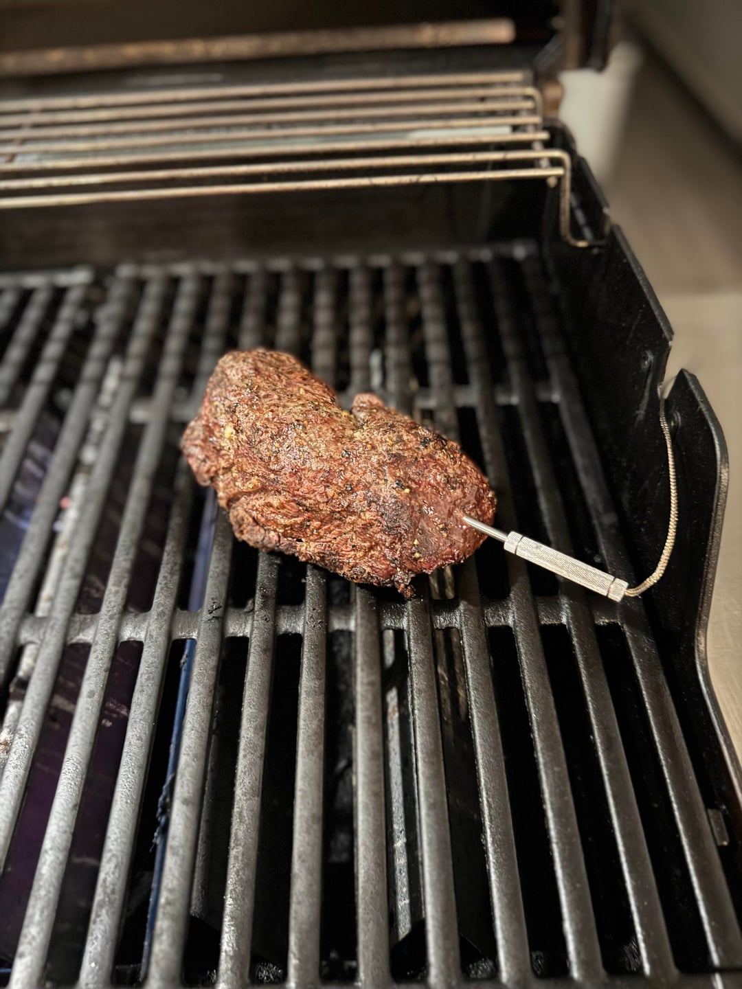 I added oil, salt, and pepper, then seared for 4 minutes per side at high heat, moved to indirect heat until it reached 140 F (medium rare), then rested for 10 minutes. Served with a side of chili garlic mushrooms.