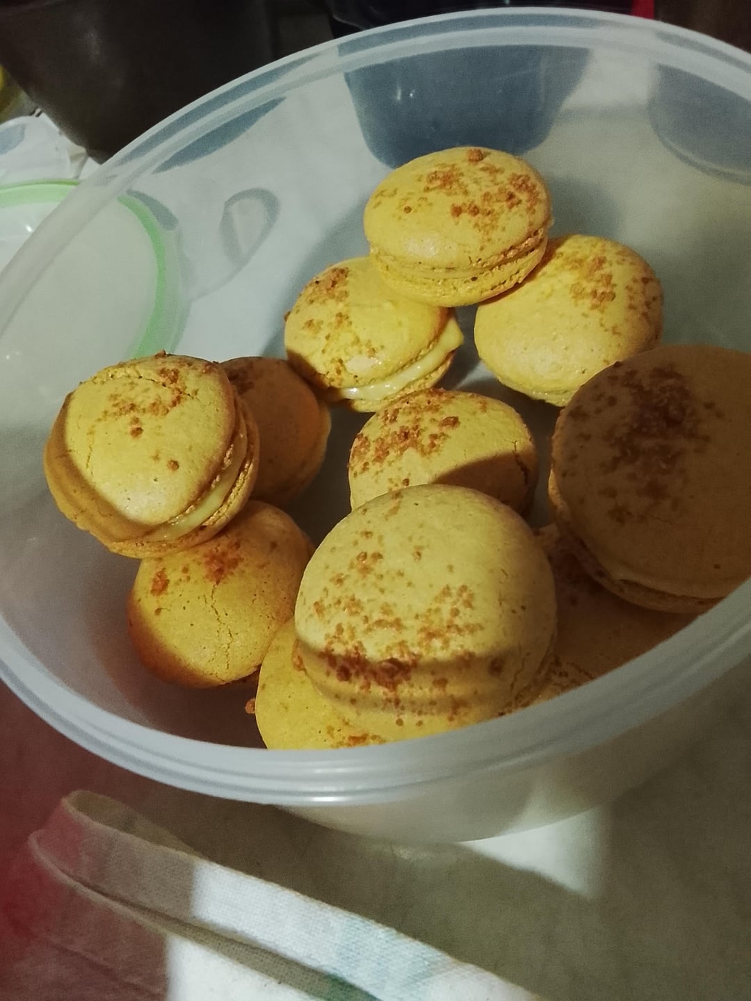 Lemon biscuit ganache flavor. They were overmixed, overbaked, with cracked and hollow shells. BUT….. Still tasty tho. I made another batch a day after this which turned out better, but oh my God I am NEVER using a silicone baking mat again. This one was advertised as being specifically for macarons and even though the second batch was baked properly they still stuck like crazy, while the regular parchment paper batch turned out perfect :')