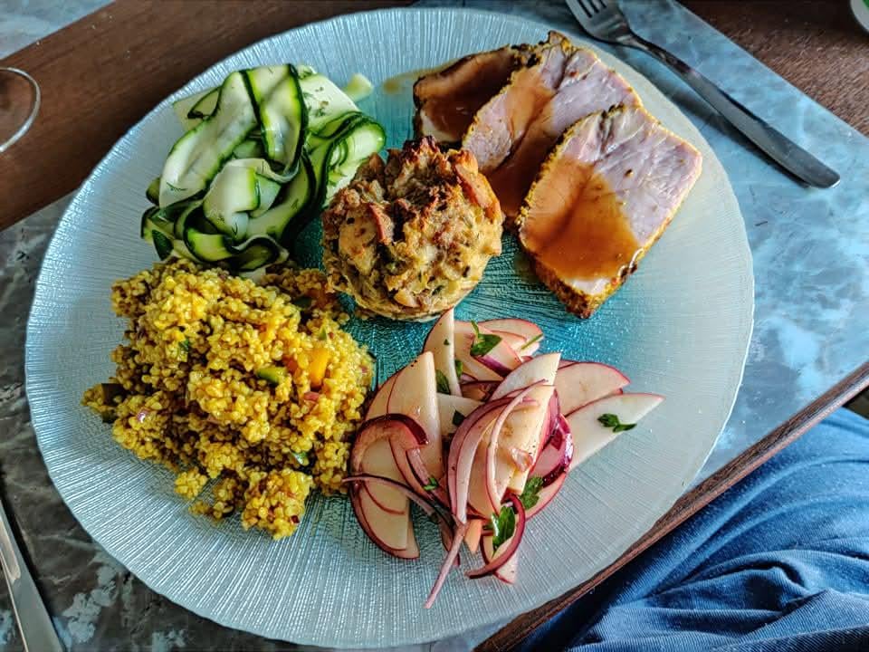 Such a delightful combination of flavors.I would definitely like a plate. Curried barley salad with peaches sounds tempting. Gravy stuffed stuffing muffins…please tell me how you did that 😀.