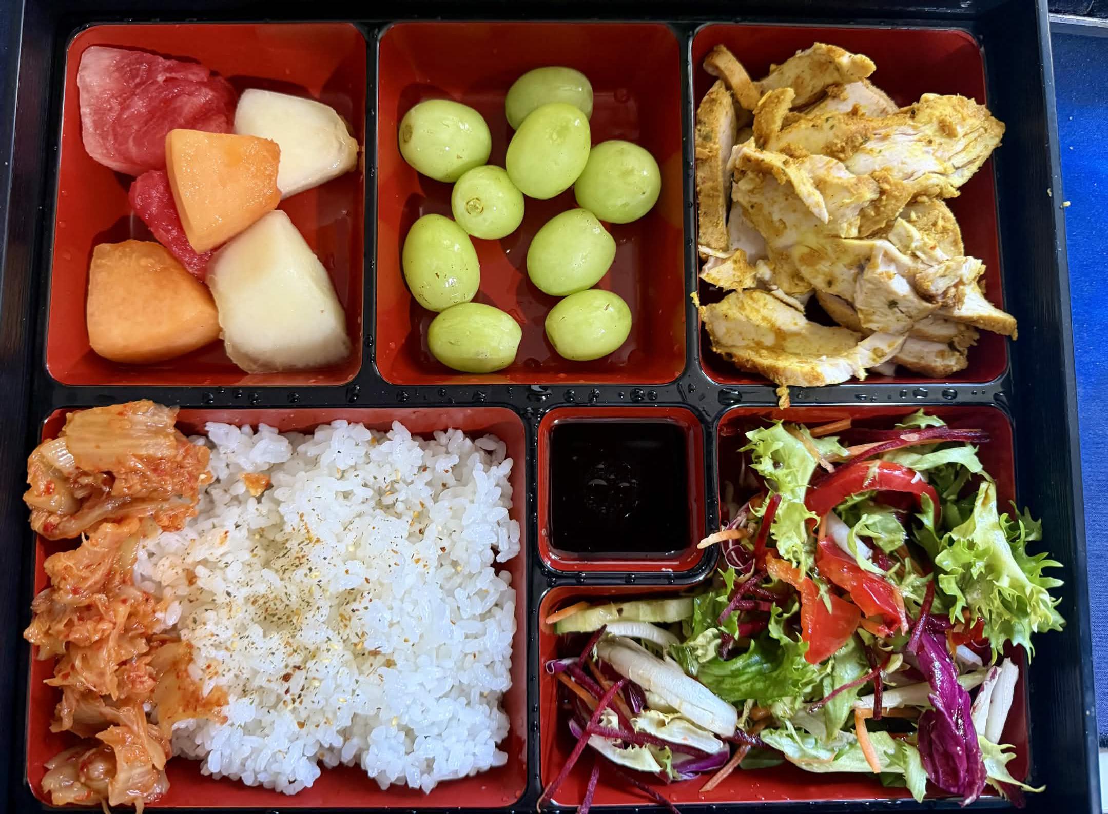 In it are rice, kimchi, salad with soy sauce and rice vinegar dressing, grapes, 3 types of melon and curry chickenby Xhaler79 Dining and Cooking