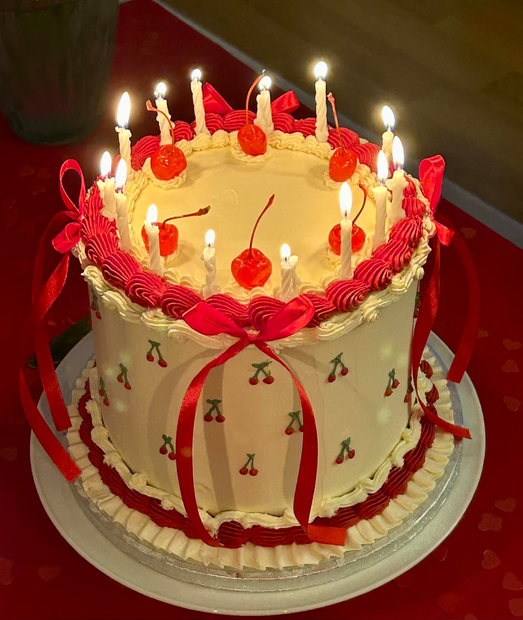 I made a black forest cake for my friend's cherry themed party 🍒 I made chocolate cake layers and a cherry syrup to soak the sponge, filled with whipped cream and morello cherries, and decorated with vanilla SMBC.