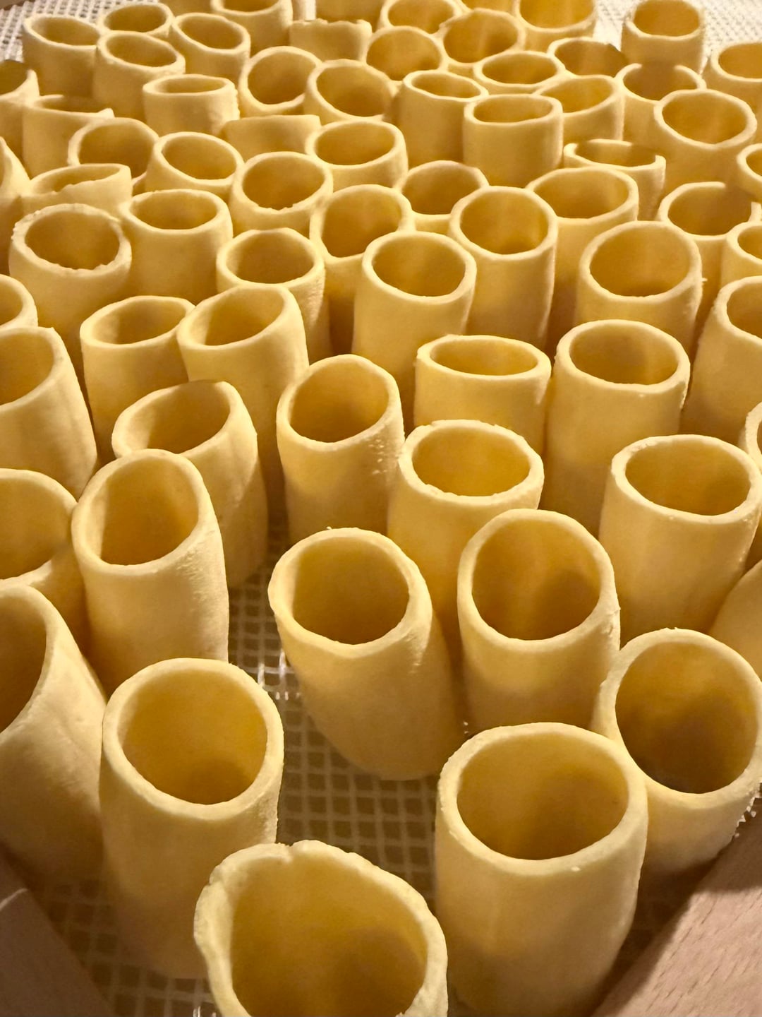 I used garlic, tallow, passata, red chilies, and the smallest amount of ricotta. With fresh extruded Paccheri.