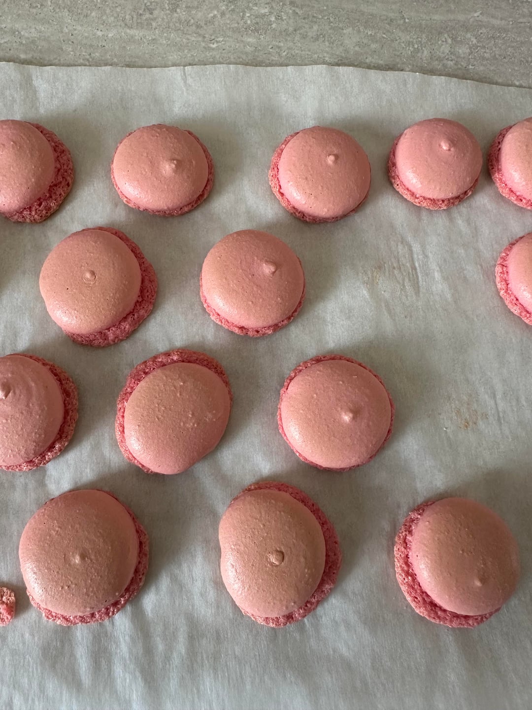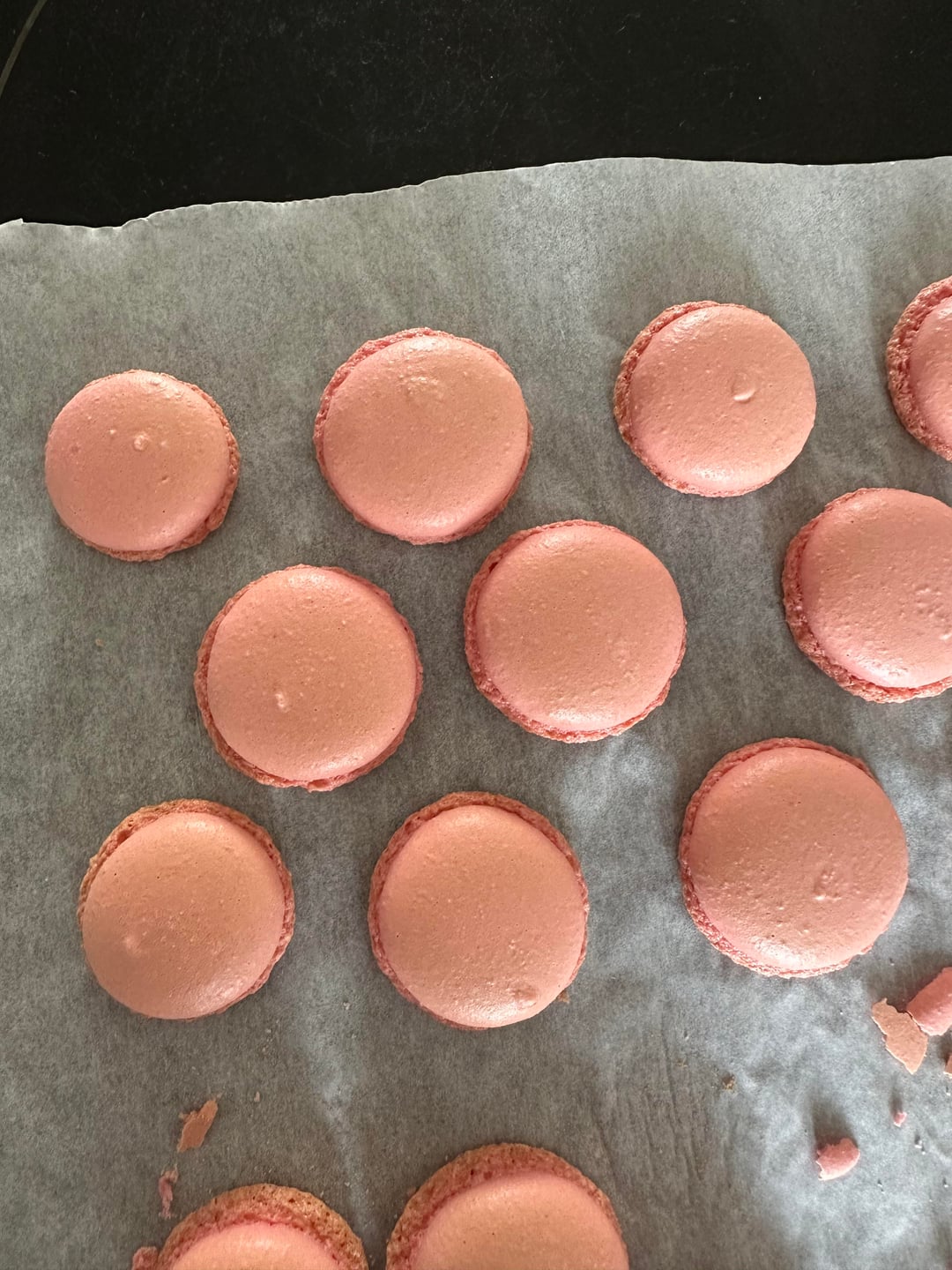 i meringued the whites and sugar, then added my sifted powder, macaroned, let it sit until just dry, baked 145 degrees celsius