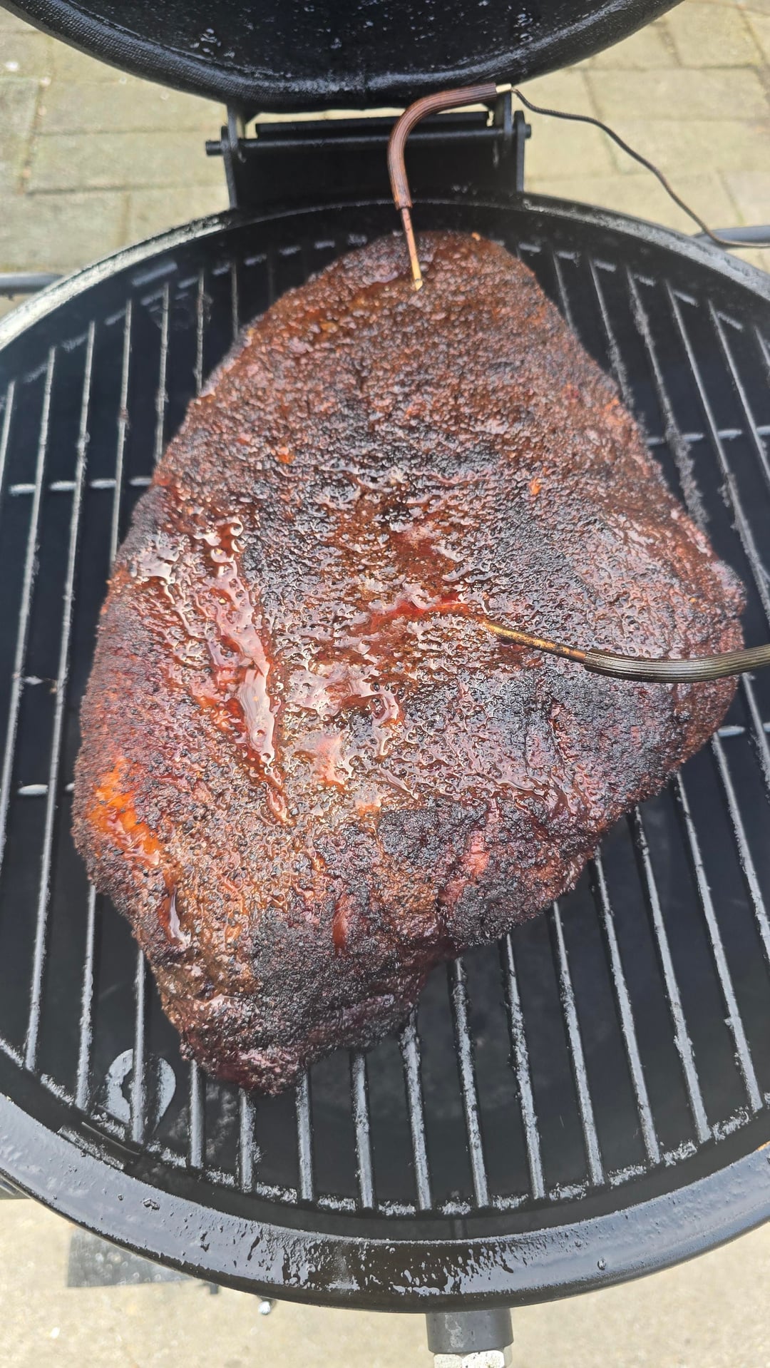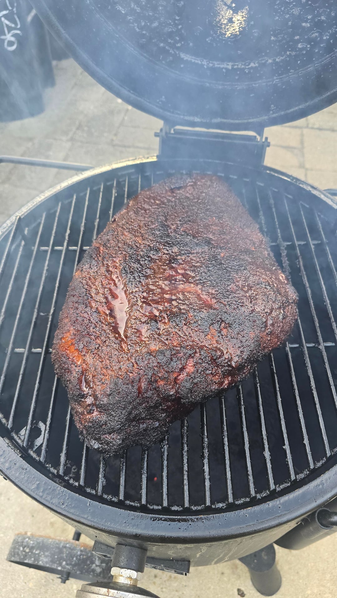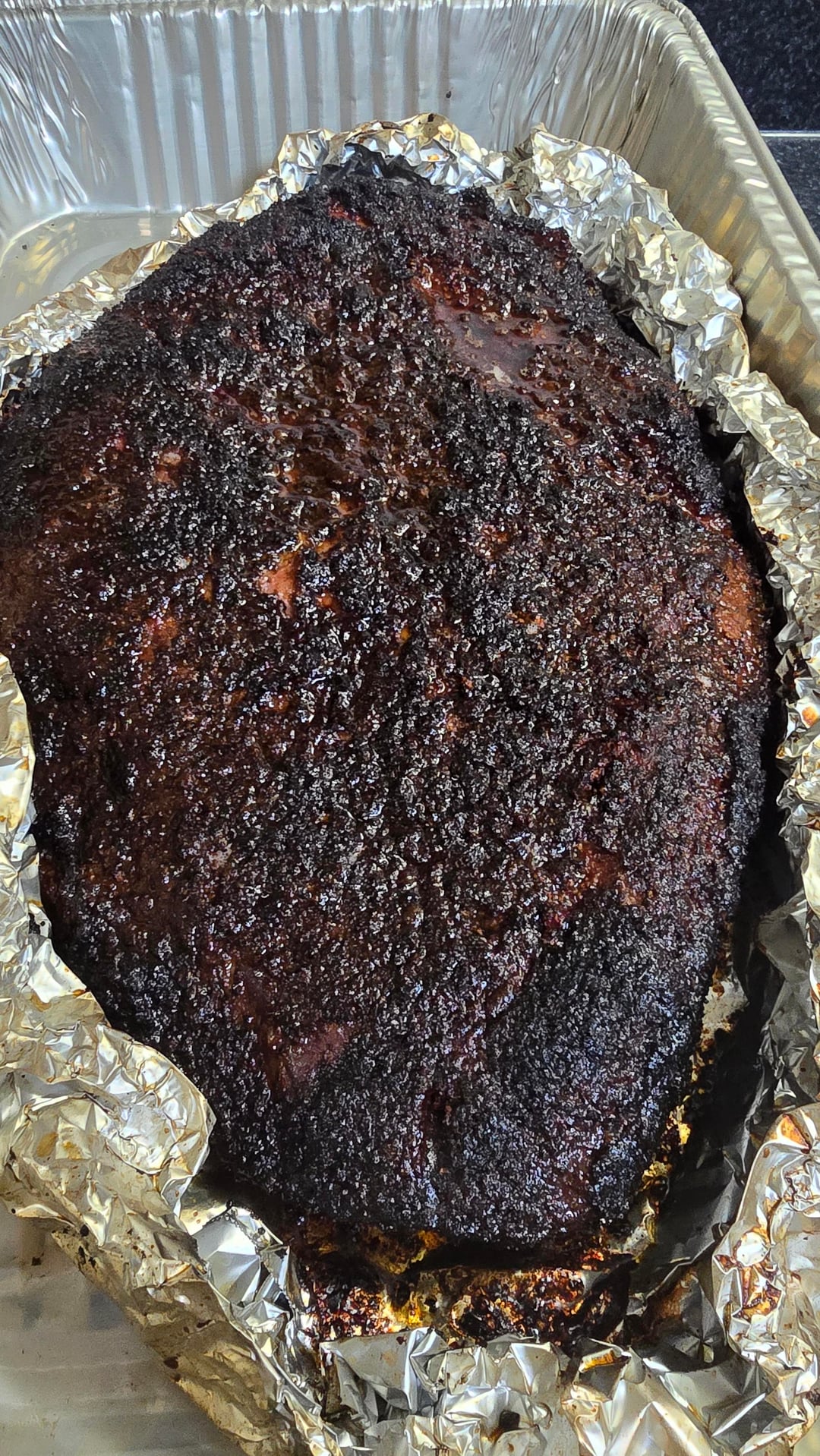 The bark developed really nicely and once the internal temperature reached around 165–170°F I switched to the foil boat method to help push through the stall while still keeping the top bark intact. The brisket cooked for roughly 12 hours total until it started probing more tender in the flat.