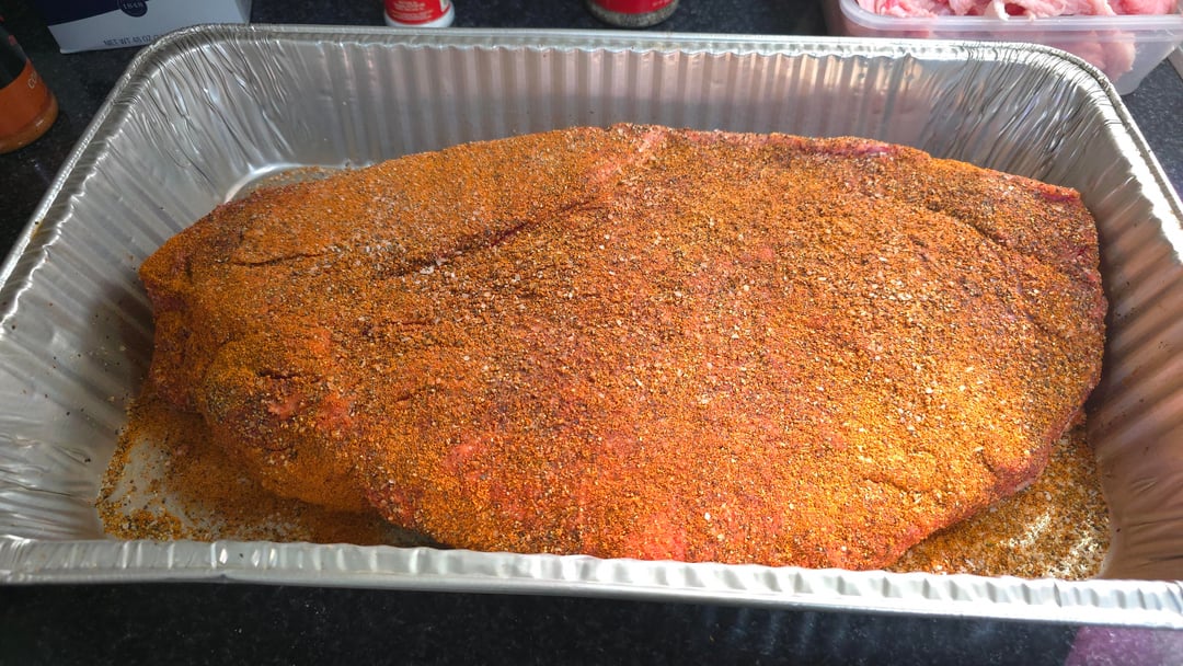 For seasoning I kept it fairly simple with SPG (salt, pepper, garlic), Kosmos Cow Cover, and a little Accent (MSG). I ran the pit mostly between about 240–265°F during the cook. Once the bark started setting I spritzed occasionally with a mix of beef consommé, Worcestershire sauce, and soy sauce.