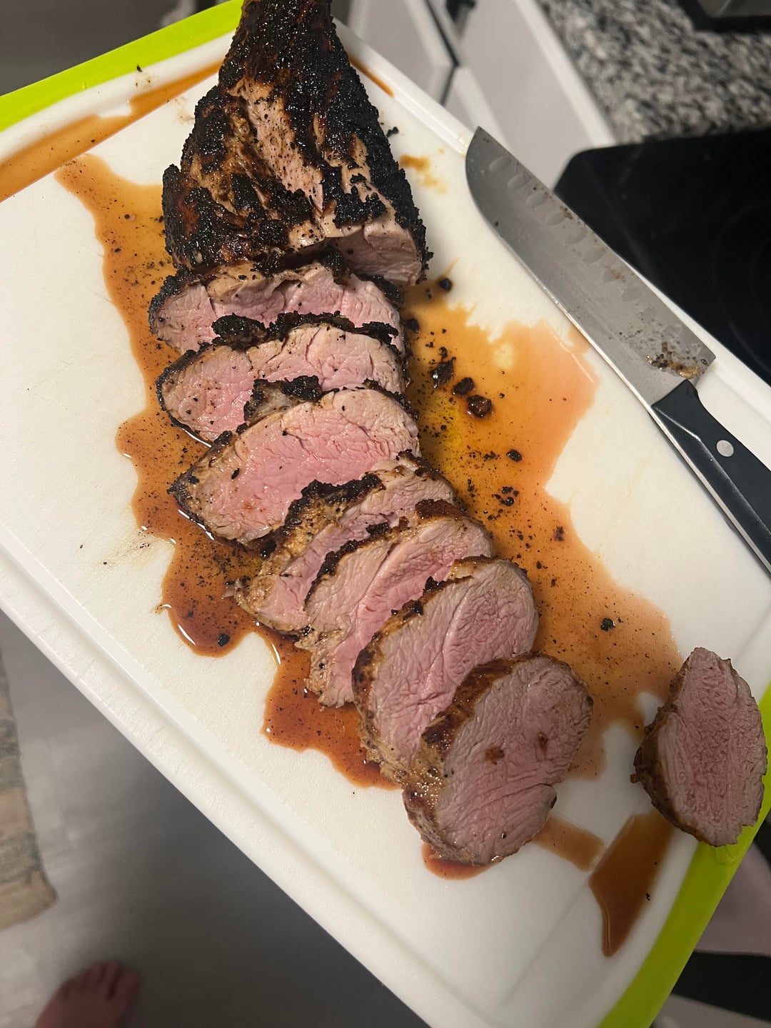 Way too over for me. The middle parts are medium, you know the top that’s unsliced is well done for sure. If the loin are shaped like this you cook the middle to rare and then slice and sear the middle.