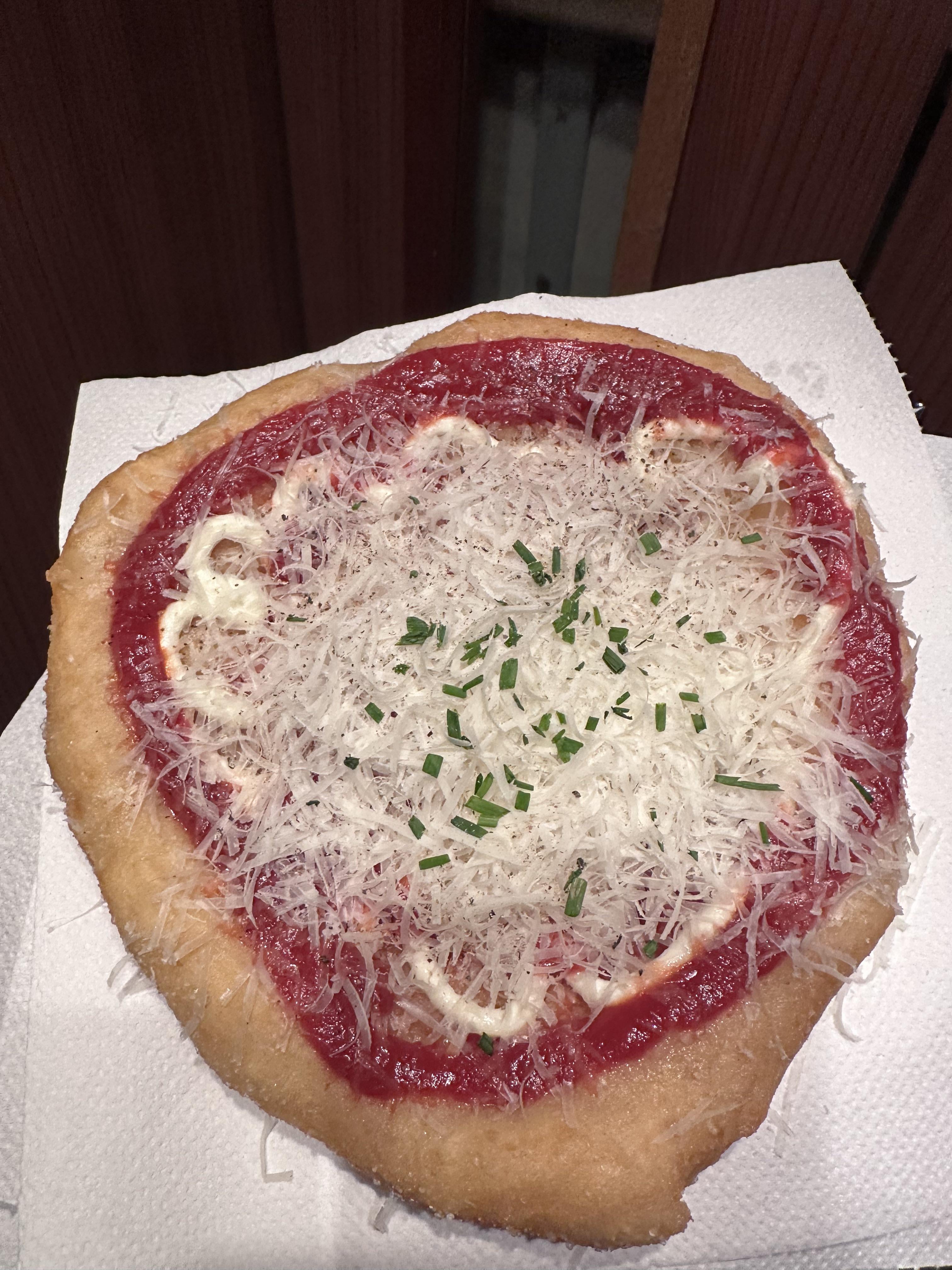 It doesn't get better than this. Langoš topped with homemade ketchup, cream cheese and mix of parmesan and pecorino. No fancy over the top toppings.