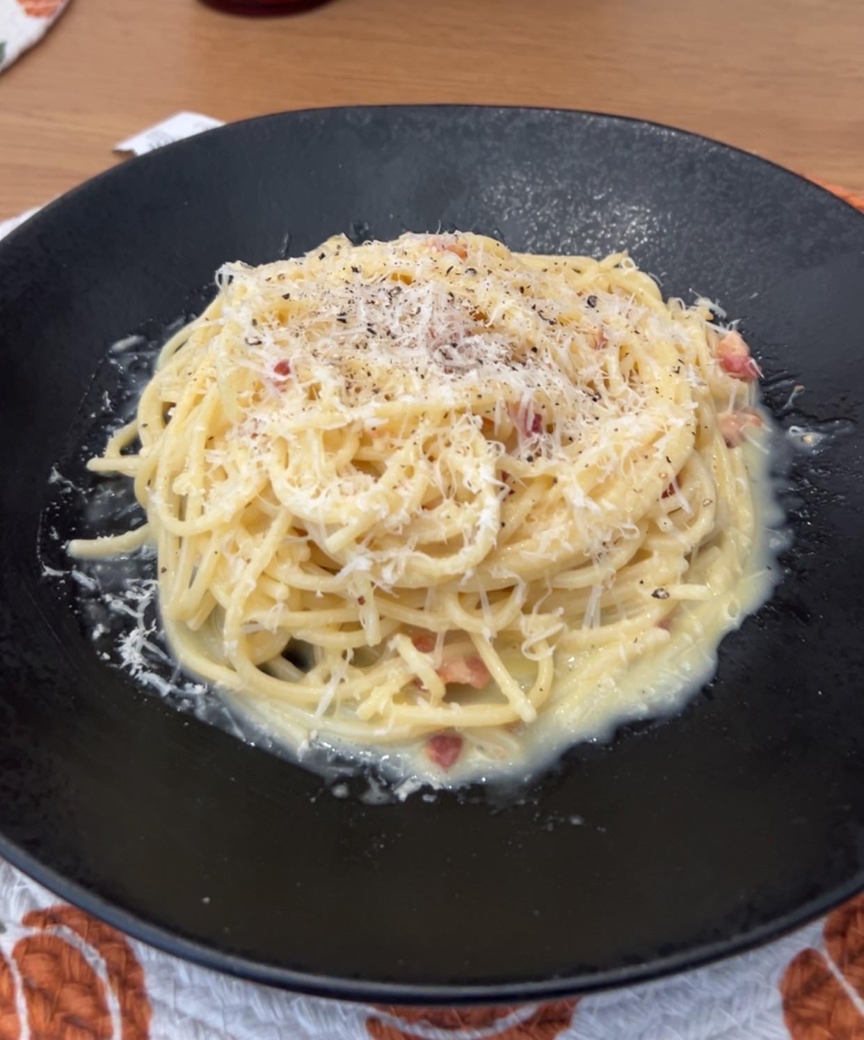 I’ve gotten into making Carbonara since our trip to Rome last year. This is with 100g Pancetta, 20g Parm, 10g Romano, 110g pasta, 3 eggs yolks, and 2g freshly ground black pepper.