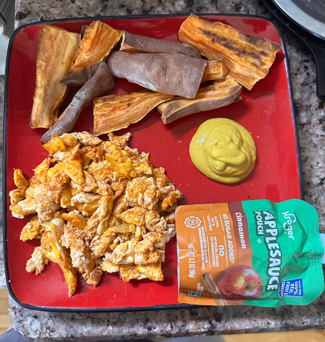 1st pic: potatoes (w/ mustard for dip), eggs w/ hot sauce, & applesauce