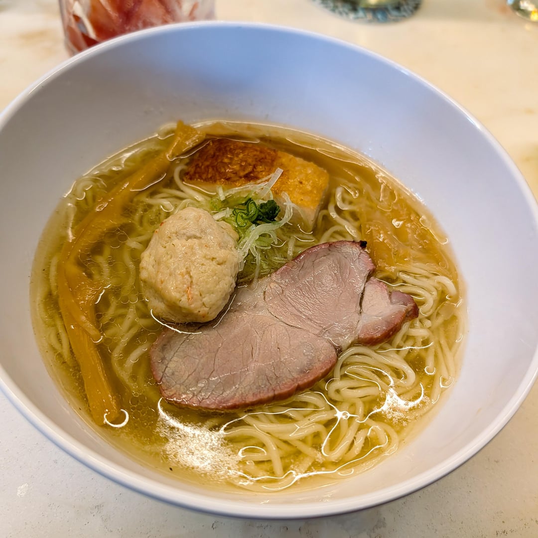 Chef Scott LaChapelle's clam shio Ramen, with thin noodles, chicken chintan soup, bbq pork shoulder chashu, chicken/shrimp meatball, roasted chicken thigh, Hosaki menma, scallions.