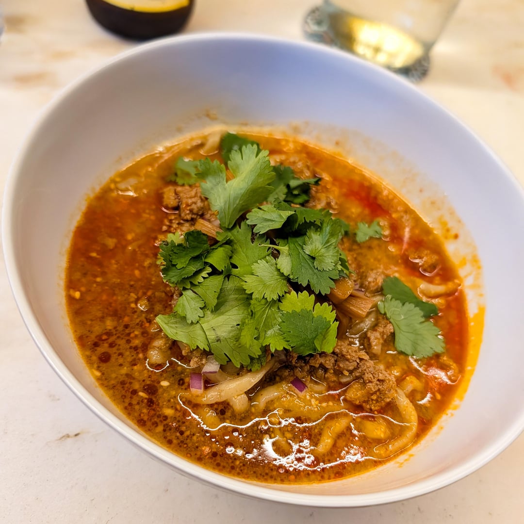 Tantanmen, with thick menma (under cilantro), pork soboro, medium hand-massaged noodles, a spicy/nutty tare sauce and finely cubed red onion.