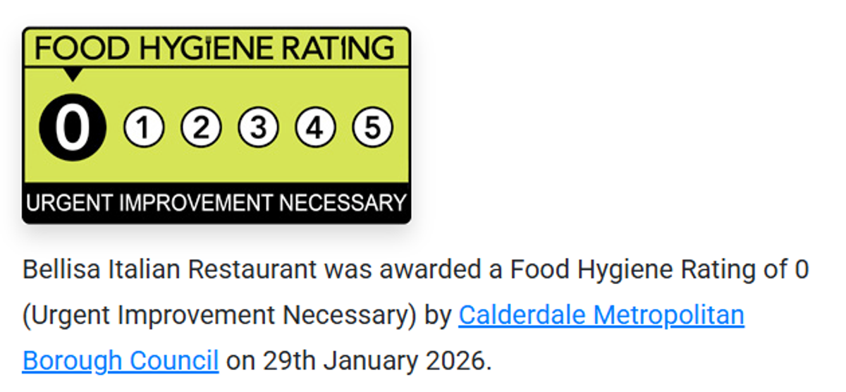 Bellisa Italian restaurant in Northowram, near Halifax, received the rock bottom rating from Calderdale Council on January 29. The council told the restaurant that “urgent improvement” was needed in relation to food hygiene and safety.