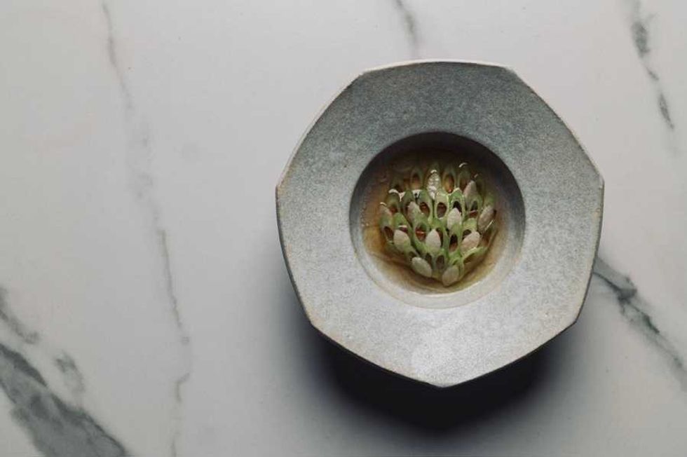 Gabon and his small team work in the open kitchen at the center of what was, until recently, Sons & Daughters. The interior of the intimate restaurant is mostly unchanged from its previous incarnation, with white marble tabletops, moody black-and-white photography, and flattering lighting that showcases the stunningly beautiful, artfully composed dishes on the tasting menu. Camera phones are out in full force at every table, as diners try to capture the magic of each dish. Mellow strains of Fleetwood Mac, Stephen Sanchez, and The Lumineers deliver a relaxed and peaceful vibe in sync with the cozy space and welcoming service.