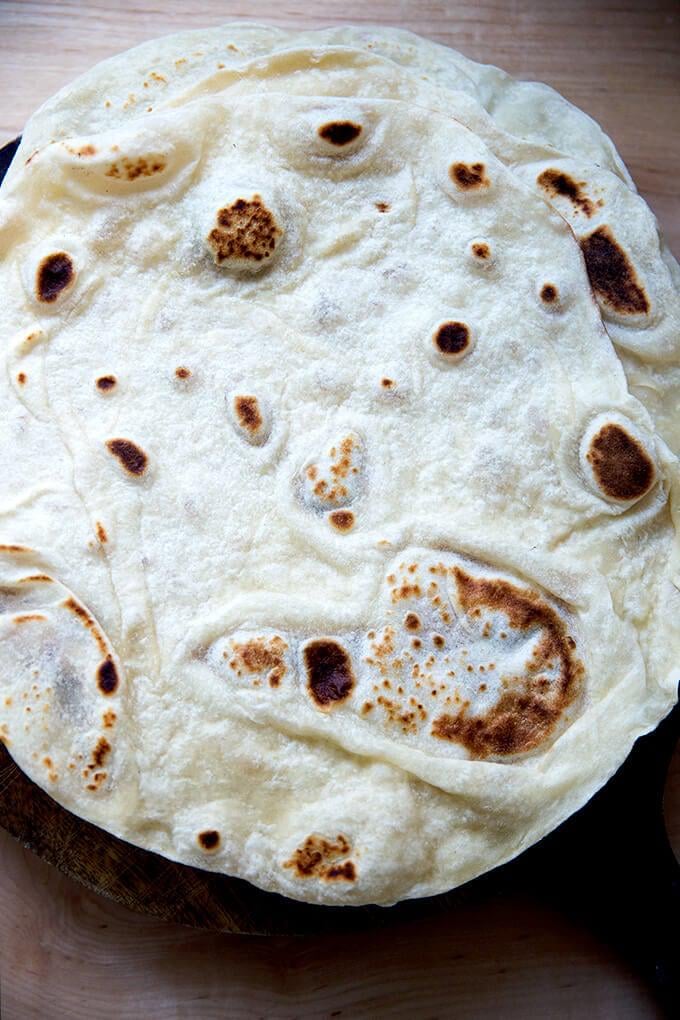 Hello! So, I tried making flour tortillas today, and I found they came out dry and a bit bland? This is the recipe I used: https://alexandracooks.com/2010/01/29/bean-cheese-burritos-beef-tacos-homemade-flour-tortillas/ I scaled out all my ingredients, the only thing I did differently was add 3/4 tsp of salt instead of 1 1/4 tsp, since the recipe called for kosher and I only had table salt, but I probably should've just added the amount called for in the recipe since I felt there wasn't enough salt in the end product. I divided my dough into 5 balls (92 g each, I wanted larger tortillas) and I rolled the first one out very thin, and the others not as thin, but they all were pretty hard. I cooked the tortillas on a cast iron skillet on medium heat, around 50-60 seconds each side. there was a good amount of bubbling, and when they came out they were soft, but once they cooled down they became hard and it was hard to get filling to stay wrapped in them. I thought I was doing everything right, where could I have went wrong?