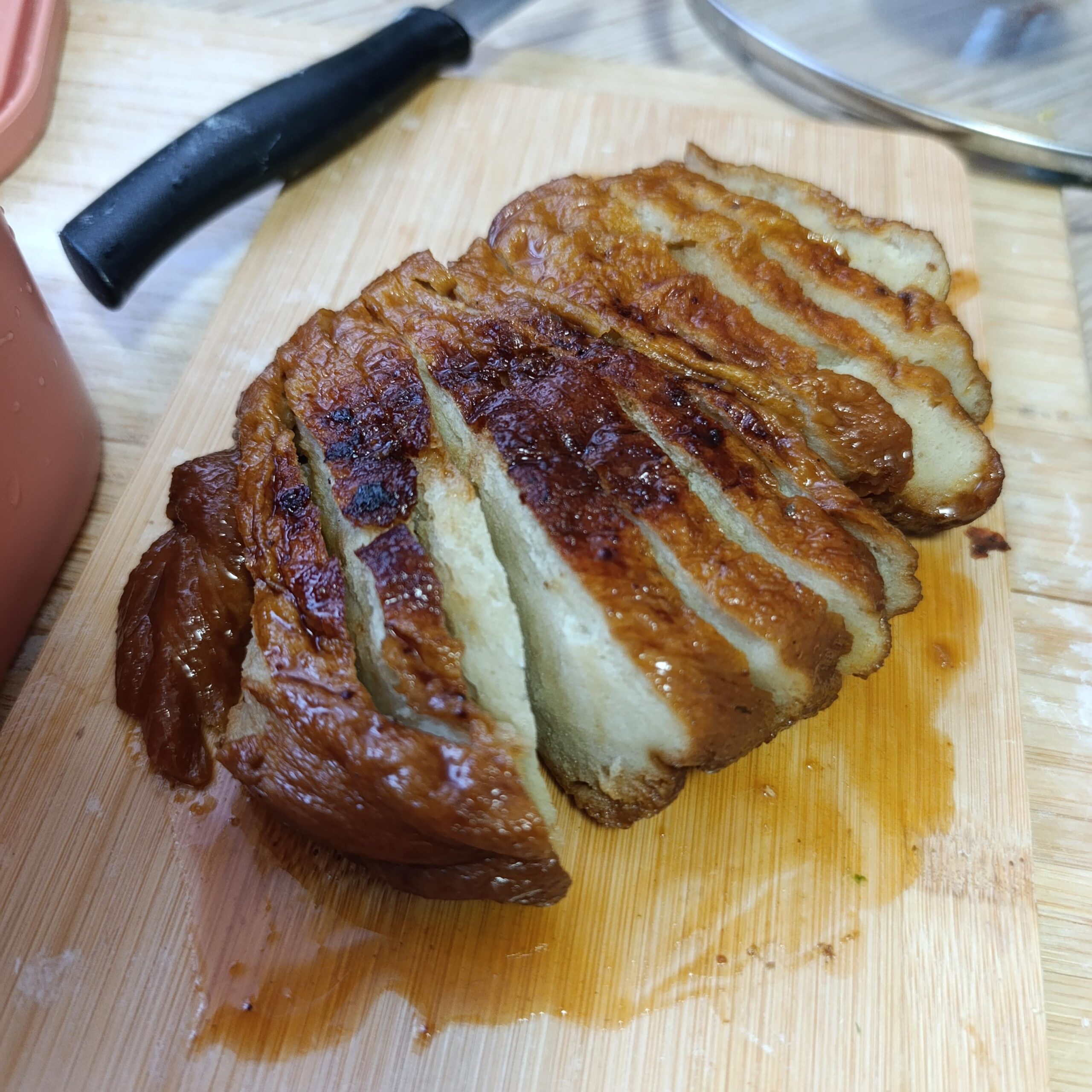 I’m surprised it’s so white on the inside after marinating. Honestly looks to me like a roasted loaf of regular bread with glaze lol