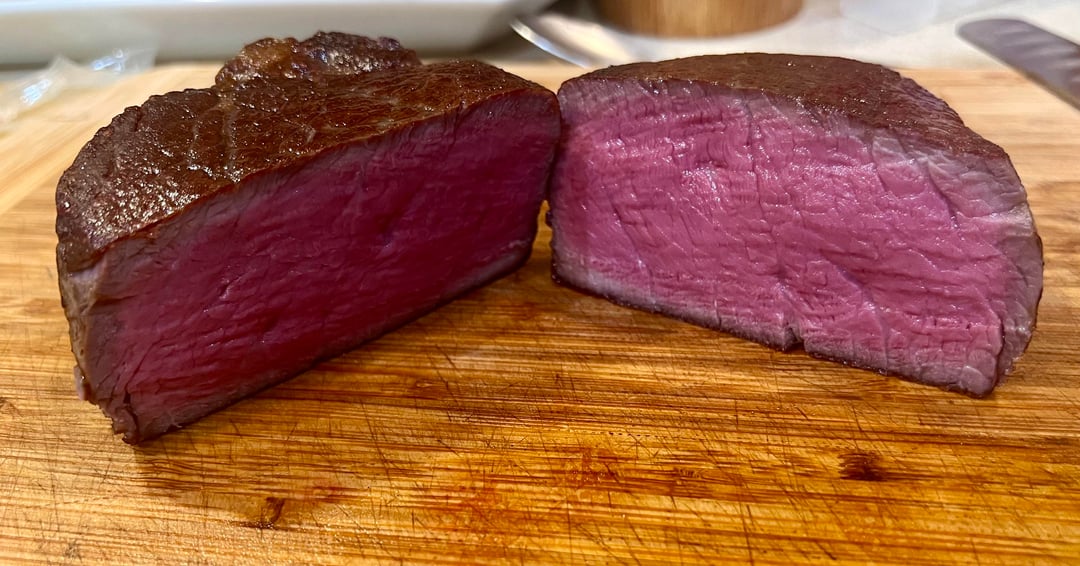 Choice filets, sous vide at 134° for 2 hours, rested then seared in tallow on stainless. Not usually huge on filets, but these came out fantastic, incredibly tender and surprisingly flavorful as far as tenderloin goes.