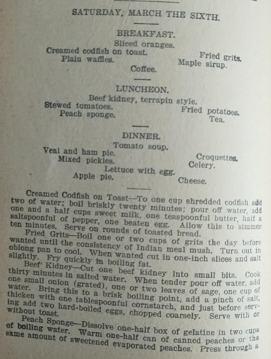 Menu March 6th 1896 by Weary-Leading6245 3 Comments Actual-Mechanic-2795 3 weeks ago 780777 DaughterOfFishes 3 weeks ago This looks lovely Mildred but unfortunately I, uh, have a previous engagement and will most sadly be forced to eat out all day. terrorcotta_red 3 weeks ago Today’s apple pie escapes being a ‘mock’ apple pie only by virtue of having apple sauce in it. Still, a charming, if overworked, meal plan today!