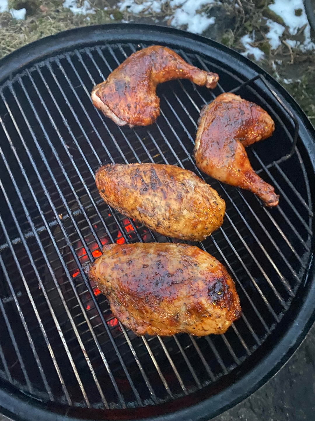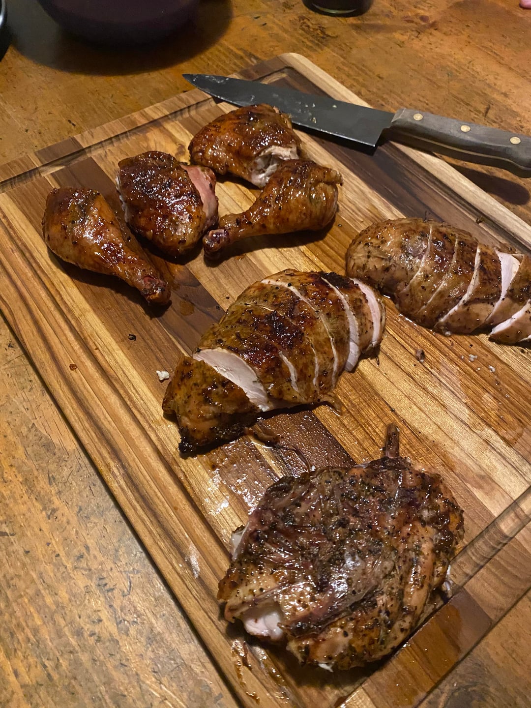 I parted this chicken & seasoned it with a mix of steak rub (I make it), Italian herb blend (I make it), oregano, fennel & lemon pepper. I smoked the chicken for 50 minutes at 275F on my “Weber Smokey Mountain” smoker using a mix of lump charcoal & mesquite wood. The chicken was cooked bone side down for the majority of the cook only flipping at the end to help crisp the skin. I basted the chicken every 8 minutes in a mix of equal parts red wine, cider, cider vinegar, & orange juice, with garlic & basil mixed with an equal amount of butter. I also made a tomato sauce utilizing fire roasted tomatoes & red bell pepper as well as the grilled wings & neck. The final picture is basil pasta, the tomato sauce, grated Parmesan, & the smoked chicken leg.