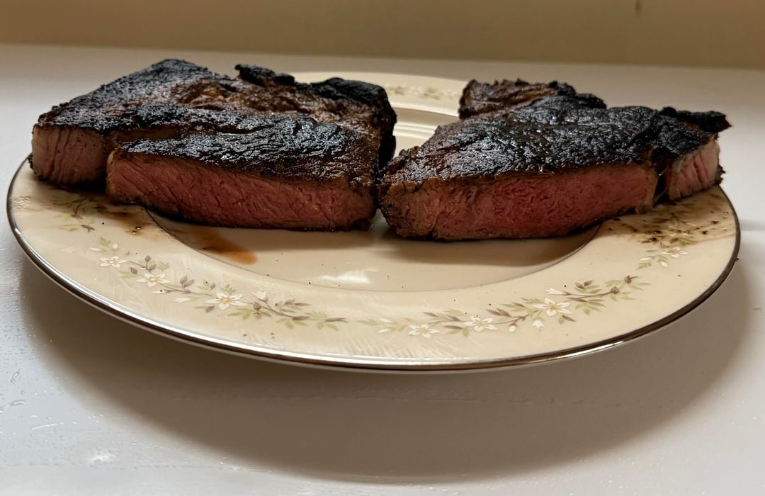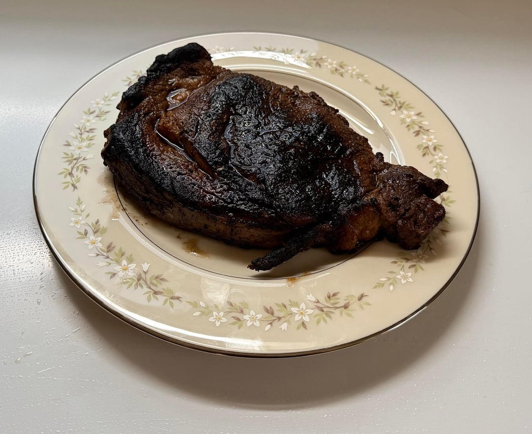 I seasoned a $15 Walmart Ribeye and then threw it in my air fryer (it’s one of those air fryer/toaster oven hybrids) on bake for 250°F occasionally flipping until it was temping at roughly 115°-120°. I pre-heated a stainless steel pan on high heat on my electric stove top and then sprayed the steak with a canola oil cooking spray before cooking for roughly 1 min on each side. I let it rest for 10 mins.