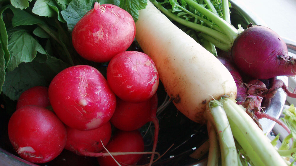 In addition to the classic red globe and dainty pink French breakfast varieties, I find the daikon has the greatest versatility. Long and slender, like a snowy cousin to carrots and parsnips, it has a mild flavor and is fabulous when chopped roughly and sauteed or stir-fried, providing a crunch similar to water chestnuts.