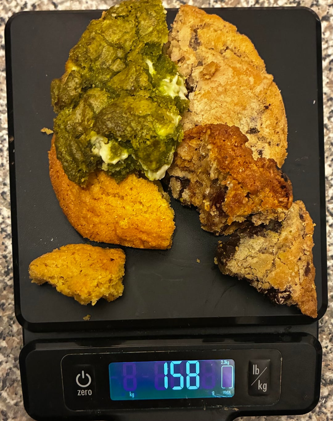 had the most amazing cookies from a place called culture espresso but now i need help estimating! its 158g for all my leftovers (i had 1/2 matcha, 1/2 of the classic chocolate chip, about 3/4 of oatmeal cranberry and 1/2 of their take on a black and white cookie) so lets assume i ate about 160-180g worth of cookie.