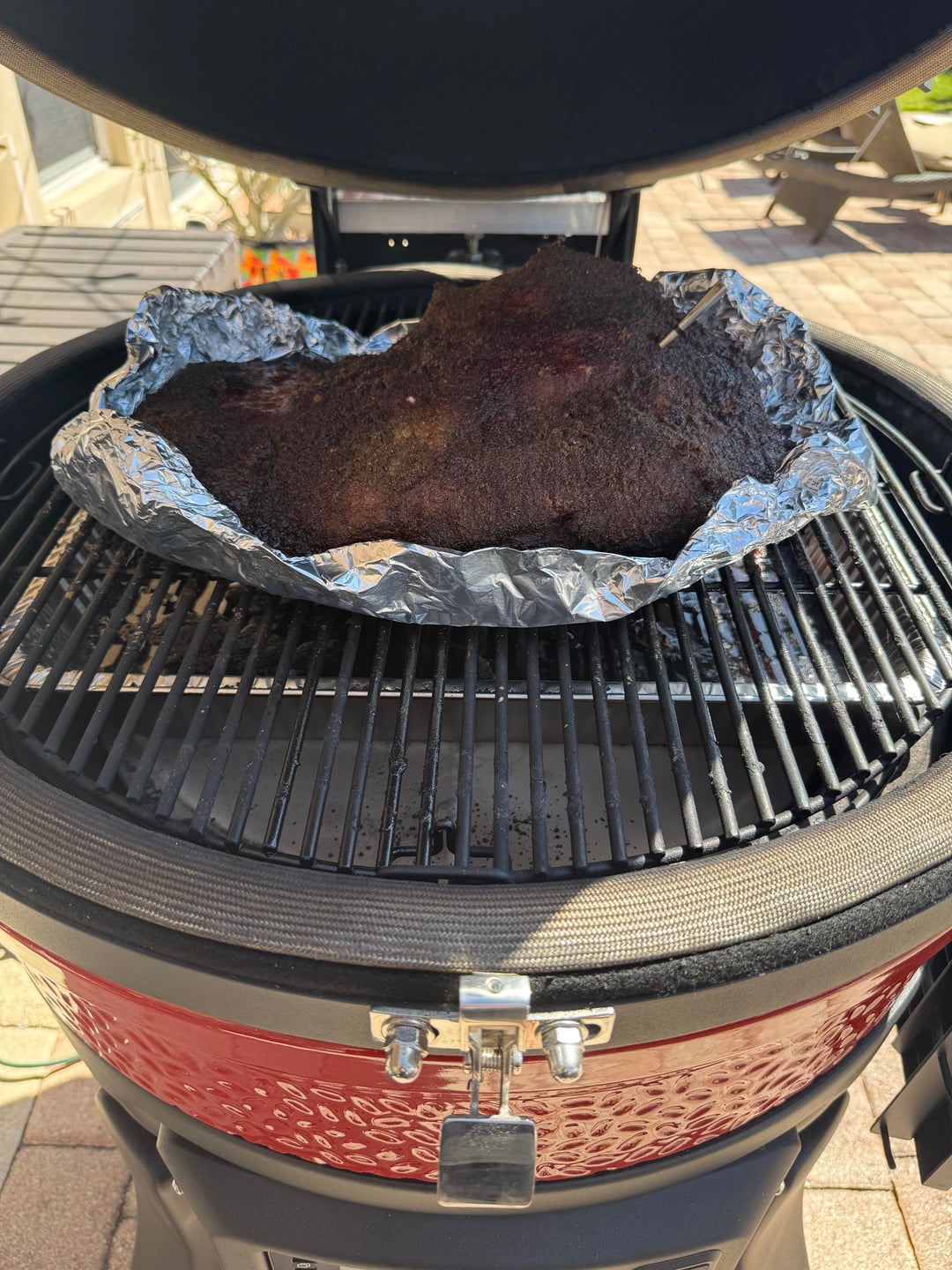 When internal thermometer reads 200-205F, remove from heat, wrap in three layers of aluminum foil + beach blankets and hold in a cooler for 1-5 hours to rest.