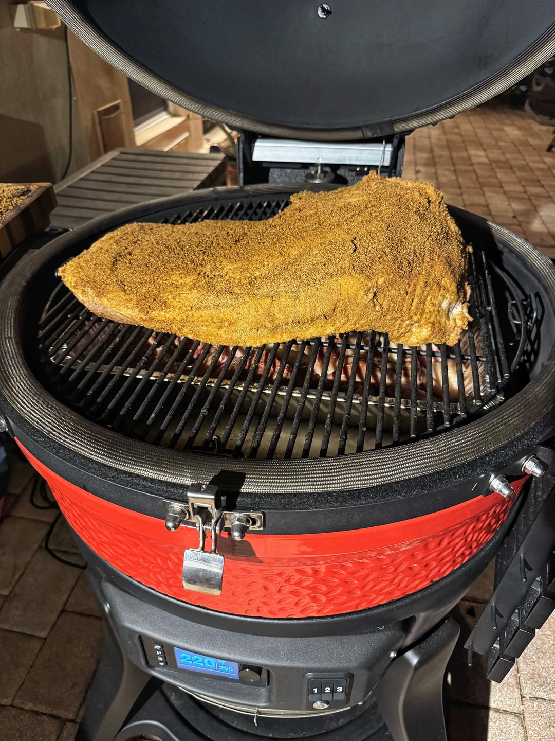 Set up Kamado Joe for indirect cooking, with three chunks of oak wood and stabilize at 250F.