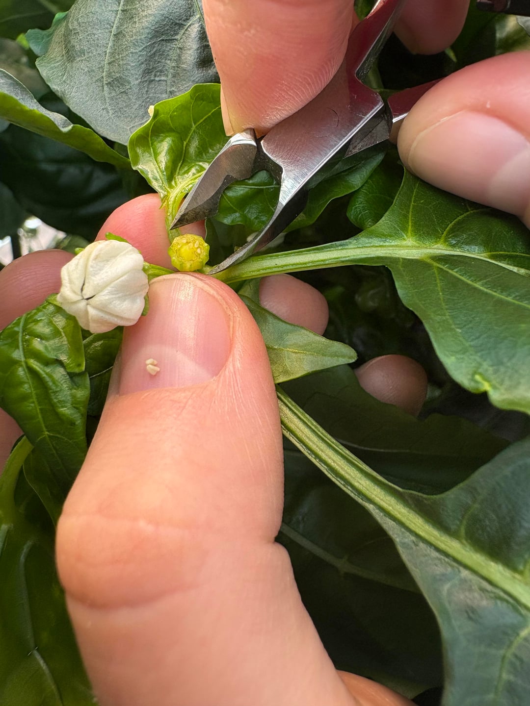 I’m doing cross pollination on capsicum annuum plants by the standard procedure of emasculating a flower on what I want to be the female parent, then sprinkling it with pollen from the male parent.