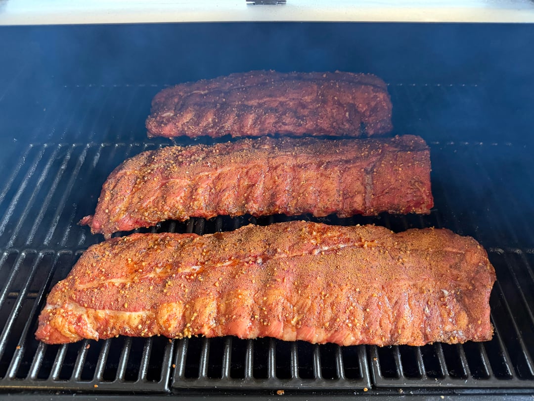 I recently got a new pellet smoker the Pit Boss 850 DX and had made some chicken, fish, St. Louis ribs, and steak so far. Today was my first time making baby back ribs on the smoker and I was blown away by the results! I used pit boss brand competition blend pellets. I opted for a light mustard binder, base rub started off using Kinder’s salt pepper and garlic blend. Then I did a light coat of a new rub I saw at Costco called Cowboy Candy it had a little jalapeño in it and then topped it off with a dusting of Kinder’s bourbon peach rub.