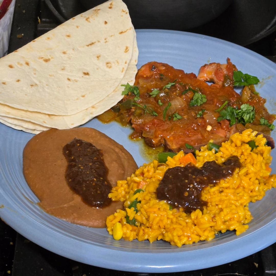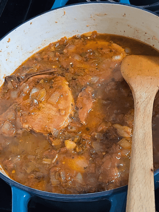 I used a molcajete to grind up some garlic, cumin seeds and peppercorns, and coated the pork chops before braising them in a mix of tomatoes, onions and a couple jalapeños…