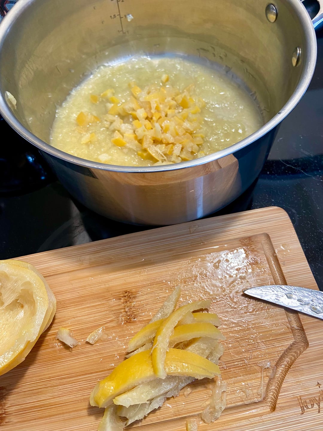 Let lemons cool slightly then cut open. Scoop out the inside flesh and seeds into the pot. Remove and discard seeds. Slice and finely dice the softened peel. Add peel back into pot. Add 2–2½ cups sugar to pot. Pour reserved boiling water back in pot and stir well.