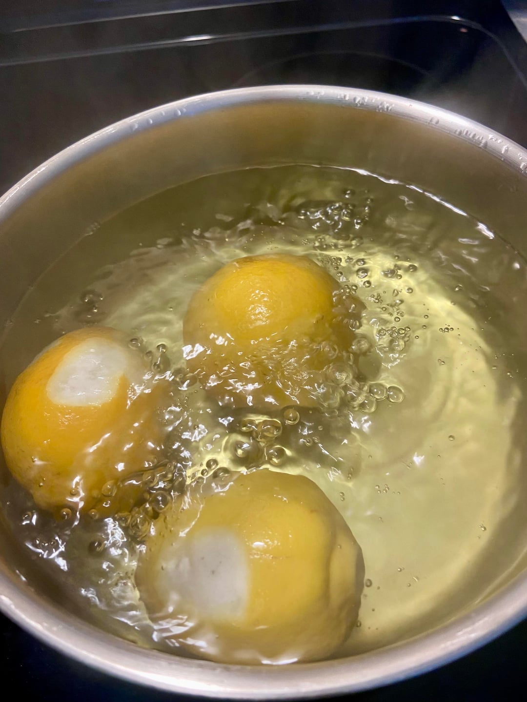 Wash lemons well and place whole lemons in a pot. Cover with water. Bring to a boil, then simmer 10 minutes. Drain completely.