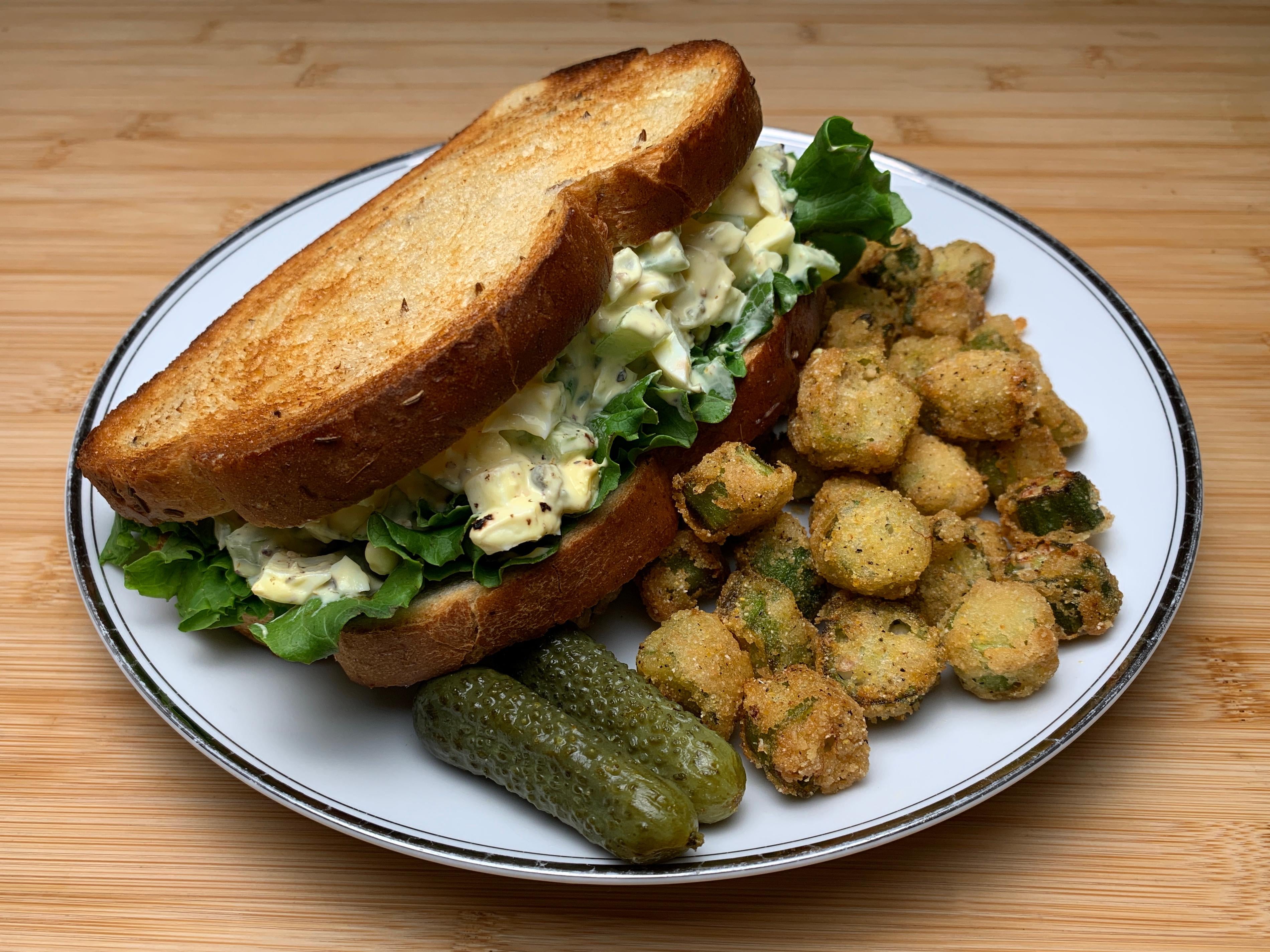 Egg Salad on Toasted Rye with Fried Okra and Dill Gherkins