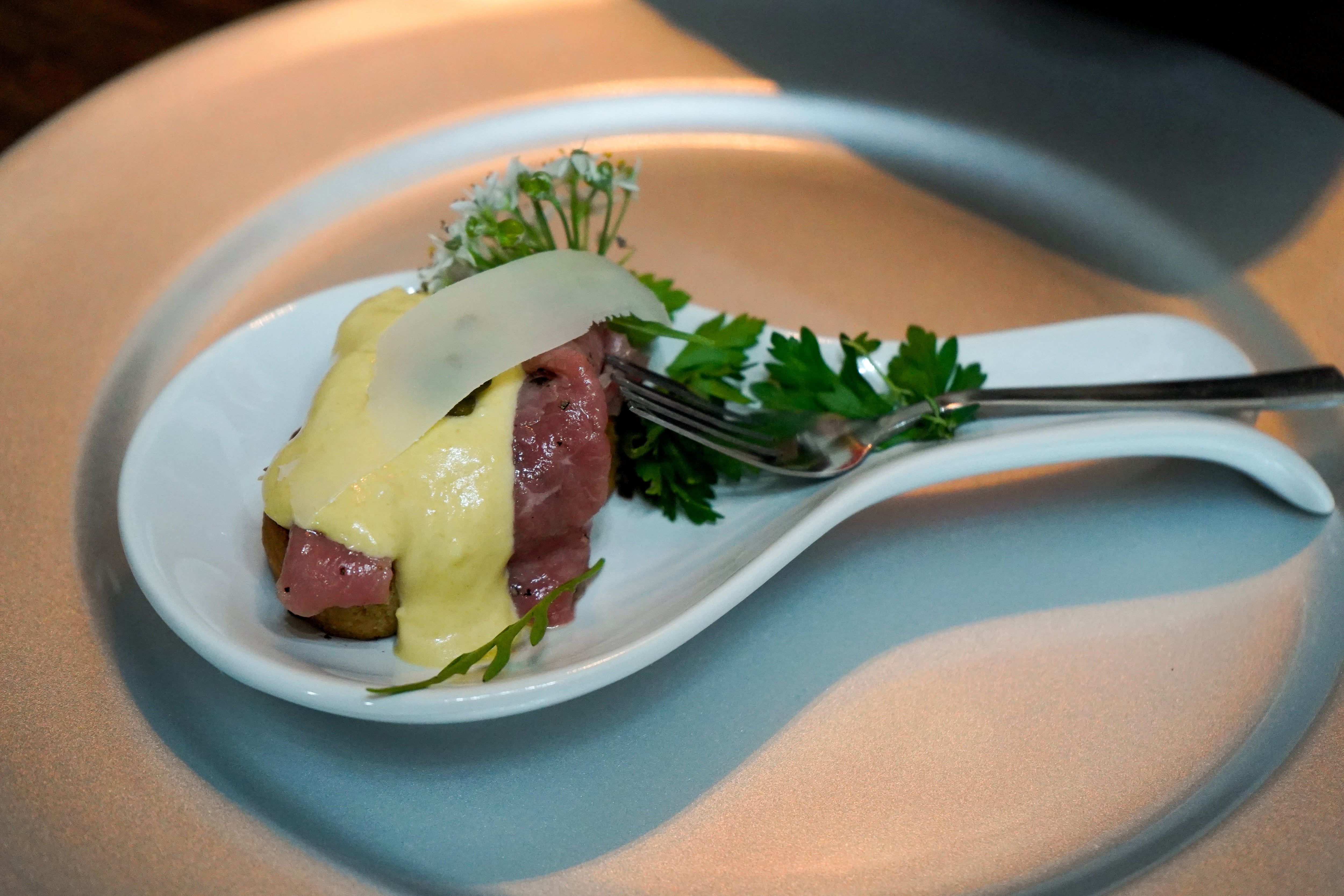Beef carpaccio with homemade mustard-and-horseradish mayonnaise, capers and parmesan – a perfect partner to Oak Valley Sounds of Silence Pinot Noir. (NICOLE SHAW)