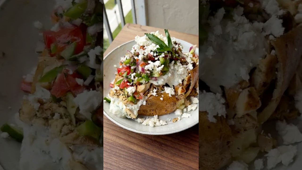 Greek Chicken Jacket Potatoes… easy, high-protein & loaded with flavour. Crispy-skinned russet potatoes are baked until fluffy, then loaded with juicy, marinated grilled chicken, garlicky tzatziki, a bright chopped Greek salad, and briny crumbled feta. It’s a balanced, protein-packed meal that delivers an explosion of flavours and textures in every bite