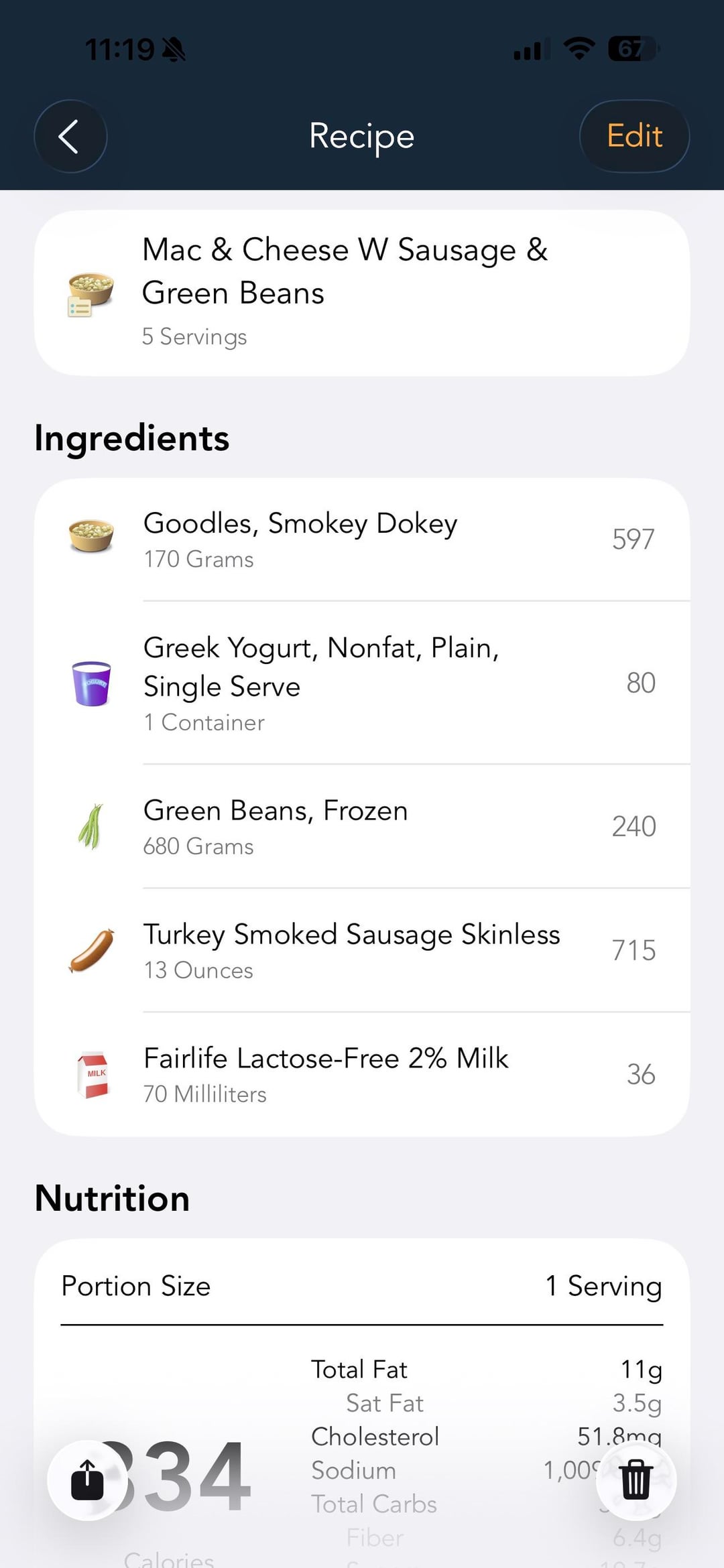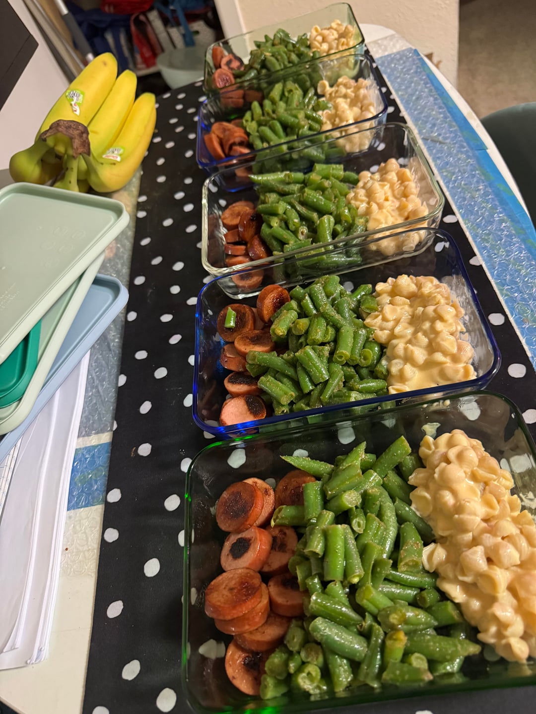 One pack of turkey sausage, two bags of frozen green beans, and a box of Goodles Smokey Dokey protein mac w a single serve container of plain Greek yogurt added to it. Not my best macros and it is high in sodium, but this is the type of meal I recommend to people who are new to this and don’t know where to start. Freezes well, super quick to make, hits the comfort food cravings, super reasonable calorie count.